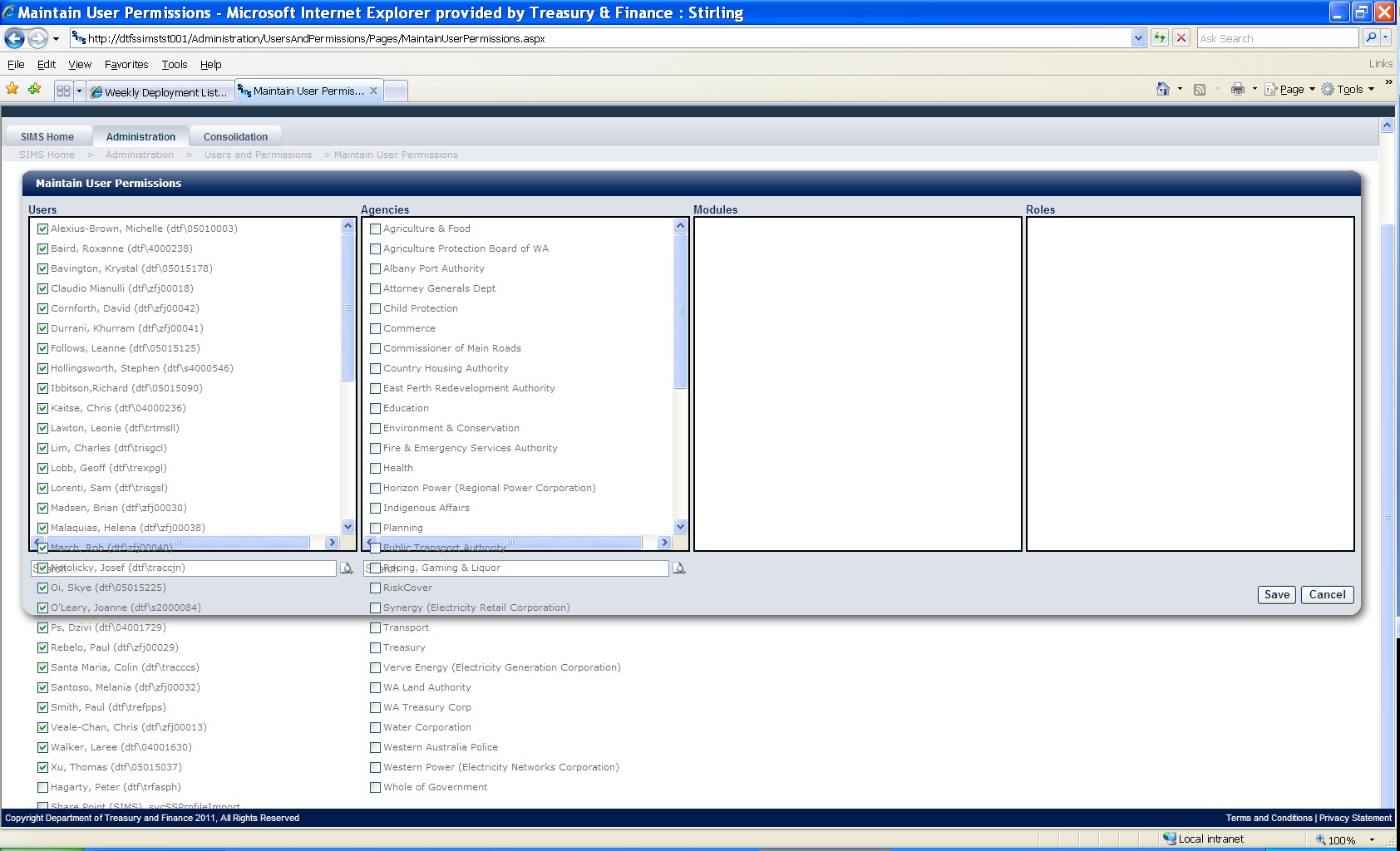 <%@ Assembly Name="SIMS.UI.UserControls, Version=1.0.0.0, Culture=neutral, PublicKeyToken=bc6fb793b8a12a45" %> <%@ Control Language="C#" AutoEventWireup="true" CodeBehind="MaintainUserPermissions.ascx.cs" Inherits="SIMS.UI.UserControls.Security.MaintainUserPermissions" EnableViewState="true" %> <%@ Register TagPrefix="sims" TagName="DisplayMessageControl" Src="~/_Layouts/SIMSControls/Common/UserControls/DisplayMessageControl.ascx" %> <%@ Register TagPrefix="sims" TagName="MessagePrompt" Src="~/_Layouts/SIMSControls/Common/UserControls/MessagePromptControl.ascx" %> <asp:ScriptManagerProxy ID="maintainUserPermissionsScriptManagerProxy" runat="server" /> <div> <asp:Panel ID="pnlUserPermissionsContainer" runat="server"> <asp:UpdatePanel ID="mainUpdatePanel" runat="server" UpdateMode="Conditional"> <ContentTemplate> <asp:HiddenField ID="hfSiteRoleUserData" runat="server" /> <asp:HiddenField ID="hfSiteModuleData" runat="server" /> <asp:HiddenField ID="hfModuleRoleData" runat="server" /> <asp:Panel ID="pnlMessageControl" runat="server" Visible="false"> <sims:DisplayMessageControl ID="dmcMessageControl" runat="server" Visible="false" /> </asp:Panel> <table width="100%"> <tr> <td style="width: 25%; vertical-align: top"> <asp:Label ID="lblUsers" CssClass="label" Text="Users" runat="server" /><br /> <div class="rlbDiv"> <telerik:RadListBox Width="100%" ID="rlbUsers" runat="server" CheckBoxes="true" Skin="" OnClientSelectedIndexChanged="SelectedUserChanged" OnClientItemChecked="UserChecked" /> </div> </td> <td style="width: 25%; vertical-align: top"> <asp:Label ID="lblAgencies" CssClass="label" Text="Agencies" runat="server" /><br /> <div class="rlbDiv"> <telerik:RadListBox Width="100%" ID="rlbAgencies" runat="server" CheckBoxes="true" Skin="" OnClientSelectedIndexChanged="SelectedAgencyChanged" OnClientItemChecked="AgencyChecked" /> </div> </td> <td style="width: 25%; vertical-align: top"> <asp:Label ID="lblModules" CssClass="label" Text="Modules" runat="server" /><br /> <div class="rlbDiv"> <telerik:RadListBox Width="100%" ID="rlbModules" runat="server" CheckBoxes="true" Skin="" OnClientSelectedIndexChanged="SelectedModuleChanged" OnClientItemChecked="ModuleChecked" /> </div> </td> <td style="width: 25%; vertical-align: top"> <asp:Label ID="lblRoles" CssClass="label" Text="Roles" runat="server" /><br /> <div class="rlbDiv"> <telerik:RadListBox Width="100%" ID="rlbRoles" runat="server" CheckBoxes="true" Skin="" OnClientItemChecked="RoleChecked" /> </div> </td> </tr> <tr> <td style="width:25%; vertical-align: top"> <table style="width:100%; vertical-align: top"> <tr> <td> <asp:TextBox ID="txtUserFilter" runat="server" Text="Search..." ForeColor="Gray" onblur="WaterMark(this, event);" onfocus="WaterMark(this, event);" CssClass="rlbTextbox" /> </td> <td style="width:5%"> <asp:ImageButton ID="btnUserSearch" runat="server" AlternateText="Search..." CommandName="UserSearch" CssClass="button" /> </td> </tr> </table> </td> <td style="width:25%; vertical-align: top"> <table style="width:100%; vertical-align: top"> <tr> <td> <asp:TextBox ID="txtAgencyFilter" runat="server" Text="Search..." ForeColor="Gray" onblur="WaterMark(this, event);" onfocus="WaterMark(this, event);" CssClass="rlbTextbox" /> </td> <td style="width:5%"> <asp:ImageButton ID="btnAgencySearch" runat="server" AlternateText="Search..." CommandName="AgencySearch" CssClass="button" /> </td> </tr> </table> </td> <td></td> <td></td> </tr> </table> <table width="100%"> <tr> <%-- <td style="width:50%; vertical-align: top;"> <div align="left"> <asp:Button ID="btnUserDetails" runat="server" Text="User Details" CommandName="Details" CssClass="button" /> </div> </td>--%> <td style="width: 100%; vertical-align: top"> <div align="right"> <asp:Button ID="btnSave" runat="server" Text="Save" CommandName="Save" CssClass="button" /> <asp:Button ID="btnCancel" runat="server" Text="Cancel" CommandName="Cancel" CssClass="button" /> <asp:Button ID="btnDummy" runat="server" CssClass="button" Style="display: none" /> </div> </td> </tr> </table> <div style="position: fixed; top: 0px; left: 0px;"> <ajax:ModalPopupExtender ID="mpeDeleteConfirmMessagePrompt" runat="server" TargetControlID="btnDummy" PopupControlID="pnlDeleteConfirmMessagePrompt" BackgroundCssClass="modalBackground" BehaviorID="mpeDeleteConfirmMessagePrompt" /> <asp:Panel ID="pnlDeleteConfirmMessagePrompt" CssClass="modalPopup" Style="display: none; width: auto" runat="server"> <asp:UpdatePanel ID="pnlDeleteMessagePrompt" runat="server" RenderMode="Inline"> <ContentTemplate> <sims:MessagePrompt ID="ucDeleteConfirmMessagePrompt" MessageText="Are you sure you wish to remove all roles for this user, agency and module?" runat="server" PopupControlID="mpeDeleteConfirmMessagePrompt" ActionText="Yes" ActionCommandName="Yes" CancelText="No" CancelCommandName="No" /> </ContentTemplate> </asp:UpdatePanel> </asp:Panel> <ajax:ModalPopupExtender ID="mpeAgencyDeleteConfirmMessagePrompt" runat="server" TargetControlID="btnDummy" PopupControlID="pnlAgencyDeleteConfirmMessagePrompt" BackgroundCssClass="modalBackground" BehaviorID="mpeAgencyDeleteConfirmMessagePrompt" /> <asp:Panel ID="pnlAgencyDeleteConfirmMessagePrompt" CssClass="modalPopup" Style="display: none; width: auto" runat="server"> <asp:UpdatePanel ID="pnlAgencyDeleteMessagePrompt" runat="server" RenderMode="Inline"> <ContentTemplate> <sims:MessagePrompt ID="ucAgencyDeleteConfirmMessagePrompt" MessageText="Are you sure you wish to remove all permissions for this user and agency?" runat="server" PopupControlID="mpeAgencyDeleteConfirmMessagePrompt" ActionText="Yes" ActionCommandName="Yes" CancelText="No" CancelCommandName="No" /> </ContentTemplate> </asp:UpdatePanel> </asp:Panel> <ajax:ModalPopupExtender ID="mpeUserDeleteConfirmMessagePrompt" runat="server" TargetControlID="btnDummy" PopupControlID="pnlUserDeleteConfirmMessagePrompt" BackgroundCssClass="modalBackground" BehaviorID="mpeUserDeleteConfirmMessagePrompt" /> <asp:Panel ID="pnlUserDeleteConfirmMessage