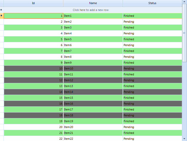 Private Sub RadGridView1_CellFormatting(sender As Object, e As CellFormattingEventArgs) Handles RadGridView1.CellFormatting If (e.CellElement.RowInfo.Cells("Name").Value & "").Contains("1") Then e.CellElement.DrawFill = True e.CellElement.GradientStyle = Telerik.WinControls.GradientStyles.Solid e.CellElement.BackColor = Color.DimGray Else e.CellElement.ResetValue(LightVisualElement.BackColorProperty, Telerik.WinControls.ValueResetFlags.Local) e.CellElement.ResetValue(LightVisualElement.GradientStyleProperty, Telerik.WinControls.ValueResetFlags.Local) e.CellElement.ResetValue(LightVisualElement.DrawFillProperty, Telerik.WinControls.ValueResetFlags.Local) End IfEnd SubI hope this information helps. Should you have further questions I would be glad to help.