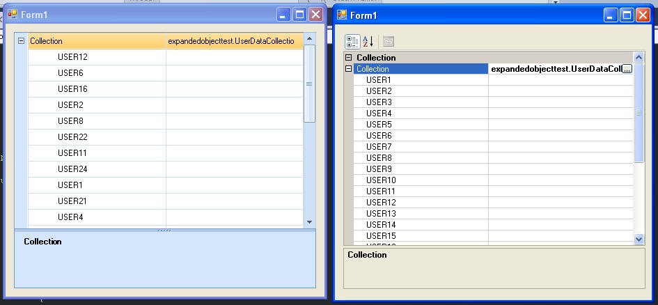public class alpha{ private UserDataCollection usd; private string test; public alpha() { usd = new UserDataCollection(); test = "Fun"; } [TypeConverterAttribute(typeof(UserDataExpandableObjectConverter))] [Category("Collection")] public UserDataCollection Collection { get { return usd; } set { usd = value; } } [Category("String")] public string Attr { get { return test; } set { test = value; } }}The form: