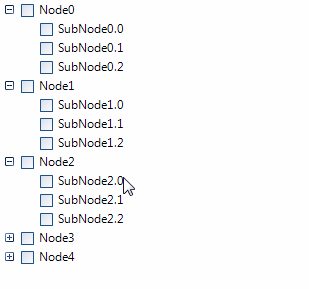 public Form1(){ InitializeComponent(); this.radTreeView1.NodeFormatting += radTreeView1_NodeFormatting; for (int i = 0; i < 5; i++) { CustomTreeNode node = new CustomTreeNode() { Text = "Node" + i }; for (int j = 0; j < 3; j++) { CustomTreeNode subNode = new CustomTreeNode() { Text = "SubNode" + i + "." + j }; node.Nodes.Add(subNode); } this.radTreeView1.Nodes.Add(node); } this.radTreeView1.CheckBoxes = true; this.radTreeView1.TriStateMode = true;}private void radTreeView1_NodeFormatting(object sender, TreeNodeFormattingEventArgs e){ ((RadCheckBoxElement)e.NodeElement.ToggleElement).IsThreeState = true;}public class CustomTreeNode : RadTreeNode{ public override Telerik.WinControls.Enumerations.ToggleState CheckState { get { return base.CheckState; } set { this.SetCheckStateCore(value); } }}I hope this information helps. Should you have further questions I would be glad to help.