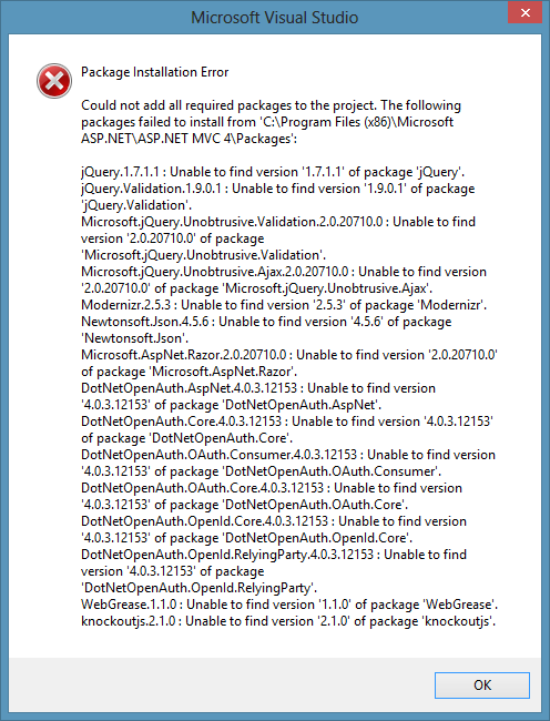 I just opened VS2012, created a new Kendo UI MVC Project, followed the wizard steps and was slapped with this (see image at Screen Shot - also attached file). It appears I am missing a ton of jQuery, Modenizr, OAuth, knockout.js, razor packages and more. Is this normal? Do I need to track down each of these packages? Once I do, will they be available for the next new project I create?