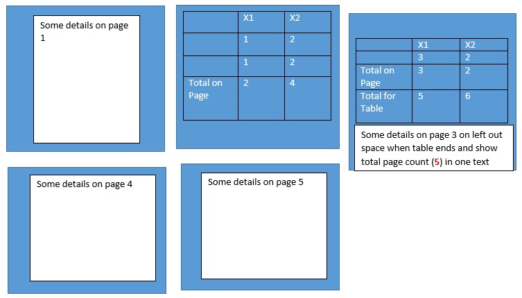 Also, the Page count details need to appear above total details of Table. Repositioning of data is not acceptable and this is the only way a report design is required. Would request to suggest alternate and solution for both the problems (Page count row positioning in a table and Total Page count value in text box as expected). Would appreciate if you can provide me some sample to depict how these can be implemented