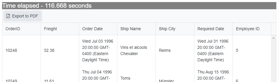 My grid is setup like below. The data comes from an API and the page initially loads completely in about 4 seconds. The excel export happens almost instantly but the pdf is still taking about 33 seconds. I have 7 columns. 4 are displayed on the screen as is and 3 have the dollar sign added and the numbers rounded to 2 decimal places. Would you happen to have any other ideas as to why mine is taking twice as long as yours?