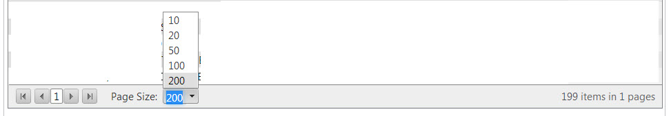 protected void RadGrid1_ItemDataBound(object sender, Telerik.Web.UI.GridItemEventArgs e) { if (e.Item is GridPagerItem) { RadComboBox PageSizeCombo = (RadComboBox)e.Item.FindControl("PageSizeComboBox"); PageSizeCombo.Items.Clear(); PageSizeCombo.Items.Add(new RadComboBoxItem("10")); PageSizeCombo.FindItemByText("10").Attributes.Add("ownerTableViewId", RadGrid1.MasterTableView.ClientID); PageSizeCombo.Items.Add(new RadComboBoxItem("20")); PageSizeCombo.FindItemByText("20").Attributes.Add("ownerTableViewId", RadGrid1.MasterTableView.ClientID); PageSizeCombo.Items.Add(new RadComboBoxItem("50")); PageSizeCombo.FindItemByText("50").Attributes.Add("ownerTableViewId", RadGrid1.MasterTableView.ClientID); PageSizeCombo.Items.Add(new RadComboBoxItem("100")); PageSizeCombo.FindItemByText("100").Attributes.Add("ownerTableViewId", RadGrid1.MasterTableView.ClientID); PageSizeCombo.Items.Add(new RadComboBoxItem("200")); PageSizeCombo.FindItemByText("200").Attributes.Add("ownerTableViewId", RadGrid1.MasterTableView.ClientID); PageSizeCombo.FindItemByText(e.Item.OwnerTableView.PageSize.ToString()).Selected = true; } }ASPX: