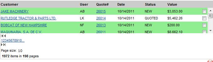 <telerik:RadGrid ID="rgSalesOrder" DataSourceID="dsSalesOrderList" ShowHeader="true" Width="676px" Height="185" AutoGenerateColumns="false" GridLines="None" AllowPaging="True" PageSize="30" runat="server" OnSelectedIndexChanged="rgSalesOrder_SelectedIndexChanged" OnItemDataBound="rgSalesOrder_ItemDataBound" OnSortCommand="rgSalesOrder_SortCommand" onpageindexchanged="rgSalesOrder_PageIndexChanged" Skin="" EnableEmbeddedSkins="False" ImagesPath="~\Images\Grid\" CssClass="grid" AllowSorting="true"> <PagerStyle Position="Bottom" AlwaysVisible="True" /> <MasterTableView AllowPaging="true" DataKeyNames="Id" AllowSorting="true"> <Columns> <telerik:GridTemplateColumn HeaderText="Customer" ItemStyle-Width="250px" HeaderStyle-Width="250px" SortExpression="Company"> <ItemTemplate> <asp:LinkButton ID="lbtnCompany" runat="server" Text='<%#Bind("Company") %>' OnClick="lbtnCompany_Click"></asp:LinkButton> </ItemTemplate> <EditItemTemplate> <asp:LinkButton ID="lbtnCompany" runat="server" Text='<%#Bind("Company") %>' OnClick="lbtnCompany_Click"></asp:LinkButton> </EditItemTemplate> </telerik:GridTemplateColumn> <telerik:GridBoundColumn HeaderText="User" DataField="CreatedBy" HeaderStyle-Width="50px" ItemStyle-Width="50px"> </telerik:GridBoundColumn> <telerik:GridButtonColumn ButtonType="LinkButton" HeaderText="Quote#" CommandName="Select" DataTextField="Id" SortExpression="Id" HeaderStyle-Width="65px" ItemStyle-Width="65px"> </telerik:GridButtonColumn> <telerik:GridBoundColumn HeaderText="Date" DataField="CreatedOn" DataFormatString="{0:MM/dd/yyyy}" HeaderStyle-Width="85px" ItemStyle-Width="85px"> </telerik:GridBoundColumn> <telerik:GridBoundColumn HeaderText="Status" DataField="OrderStatus" HeaderStyle-Width="70px" ItemStyle-Width="70px"> </telerik:GridBoundColumn> <telerik:GridBoundColumn HeaderText="Value" DataField="QuoteValue" HeaderStyle-Width="100px" ItemStyle-Width="100px" DataFormatString="{0:c}"> </telerik:GridBoundColumn> <telerik:GridTemplateColumn HeaderText="ACTION" SortExpression="Status" HeaderStyle-Width="155px" ItemStyle-Width="155px" HeaderStyle-HorizontalAlign="Center" Visible="false"> <ItemTemplate> <table id="tblStatus" border="0px" cellpadding="0px" cellspacing="0px" width="155px"> <tr> <td style="text-align: center"> <asp:Label ID="lblCustomerID" runat="server" Visible="false" Text='<%# Bind("CustomerId") %>'></asp:Label> <asp:Label ID="lblStatusID" runat="server" Visible="false" Text='<%# Bind("Status") %>'></asp:Label> <asp:Label ID="lblStatus" runat="server" Visible="false" Text='<%# Bind("Status") %>'></asp:Label> <asp:Label ID="lblRowStyle" runat="server" Visible="false" Text='<%# Bind("RowStyle") %>'></asp:Label> </td> </tr> </table> </ItemTemplate> </telerik:GridTemplateColumn> <telerik:GridTemplateColumn HeaderText="" ItemStyle-HorizontalAlign="Right"> <ItemTemplate> <asp:CheckBox runat="server" ID="chkSelect" /> </ItemTemplate> <EditItemTemplate> <asp:CheckBox runat="server" ID="chkSelect" /> </EditItemTemplate> </telerik:GridTemplateColumn> </Columns> <%--<ItemStyle CssClass="gridstyle"></ItemStyle>--%> <HeaderStyle CssClass="gridheaderstyle"></HeaderStyle> </MasterTableView> <SelectedItemStyle BackColor="#FFFFCC" /> <ActiveItemStyle BackColor="#FFFFCC" /> <ClientSettings> <Scrolling AllowScroll="True" UseStaticHeaders="true" ScrollHeight="141" /> <%--<ClientEvents OnGridCreated= "SetHeight" />--%> </ClientSettings> </telerik:RadGrid>