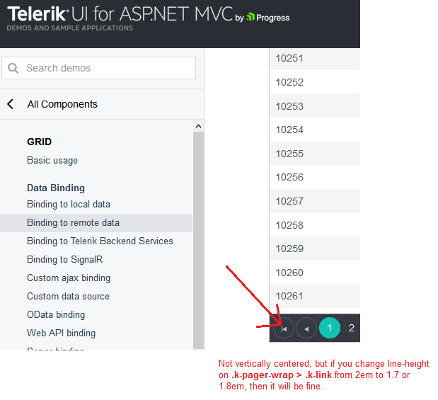 The pager icons for first/last/next/previous are not vertically aligned (See attached picture) for all themes that use round buttons (like "default", blue opal, flat, silver, etc.). However, if you change the style rule for: