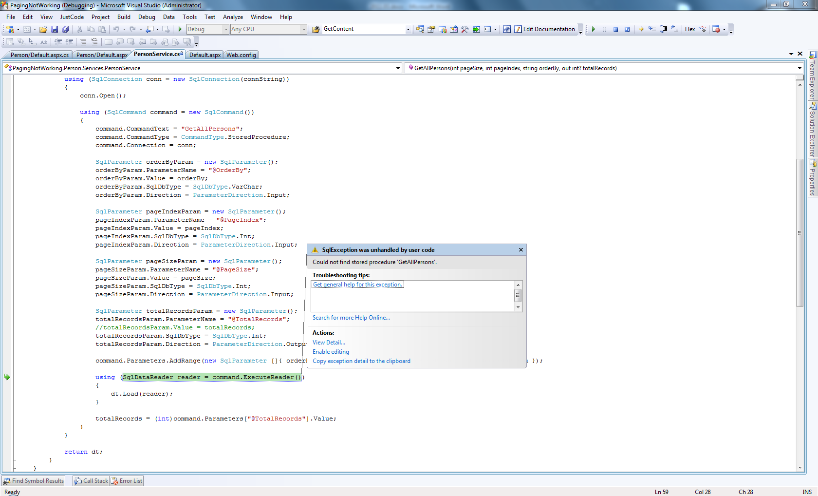 Could not find stored procedure 'GetAllPersons' (picture is attached).