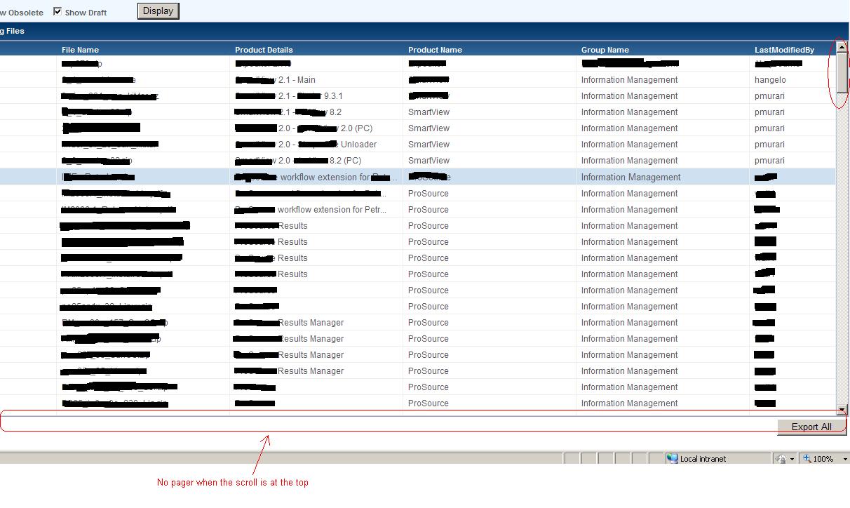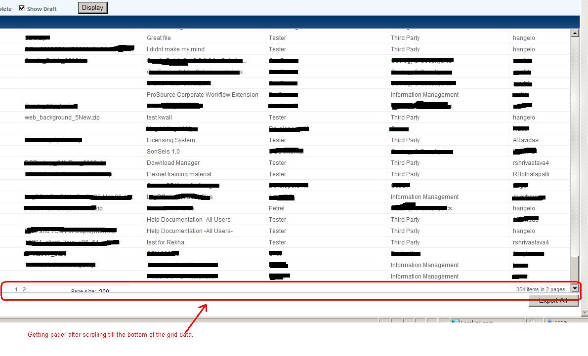 class="STArea" cellspacing="0" cellpadding="0" border="1"> <tr class="SSDetails"> <td style="height: 100%" align="center"> <div id="divMFile" runat="server" visible="true" style="overflow: auto; height: 280px; width: 100%;"> <telerik:RadGrid ID="rgridMFile" Skin="SDCSkin" runat="server" BorderStyle="Solid" BorderWidth="0px" AutoGenerateColumns="False" GridLines="None" Width="100%" Height="95%" OnSortCommand="rgridMFile_SortCommand" OnItemDataBound="rgridMFile_ItemDataBound" OnPageIndexChanged="rgridMFile_PageIndexChanged" EnableEmbeddedSkins="false" ShowFooter="false" AllowPaging="true" PagerStyle-Mode="NextPrevAndNumeric" AllowSorting="true"> <HeaderStyle Height="20px" /> <ClientSettings> <Scrolling AllowScroll="true" UseStaticHeaders="true" /> <Selecting AllowRowSelect="true" /> </ClientSettings> <MasterTableView> <Columns> <telerik:GridBoundColumn UniqueName="FNum" DataField="FNum" SortExpression="FNum" HeaderText="File ID"> <HeaderStyle HorizontalAlign="Left" Width="10%" Wrap="False" /> <ItemStyle CssClass="RadGridRow" Height="100%" Wrap="false" HorizontalAlign="left" /> </telerik:GridBoundColumn> <telerik:GridBoundColumn UniqueName="Names" DataField="Names" SortExpression="Names" HeaderText="File Name"> <HeaderStyle HorizontalAlign="Left" Width="20%" Wrap="False" /> <ItemStyle CssClass="RadGridRow" Height="100%" Wrap="false" HorizontalAlign="left" /> </telerik:GridBoundColumn> <telerik:GridBoundColumn UniqueName="FDetail" DataField="FDetail" SortExpression="FDetail" HeaderText="Prod Details"> <HeaderStyle HorizontalAlign="Left" Width="20%" Wrap="False" /> <ItemStyle CssClass="RadGridRow" Height="100%" Wrap="false" HorizontalAlign="left" /> </telerik:GridBoundColumn> <telerik:GridBoundColumn UniqueName="PName" DataField="PName" SortExpression="PName" HeaderText="Prod Name"> <HeaderStyle HorizontalAlign="Left" Width="20%" Wrap="False" /> <ItemStyle CssClass="RadGridRow" Height="100%" Wrap="false" HorizontalAlign="left" /> </telerik:GridBoundColumn> <telerik:GridBoundColumn UniqueName="Groups" DataField="Groups" SortExpression="Groups" HeaderText="Group Name"> <HeaderStyle HorizontalAlign="Left" Width="20%" Wrap="False" /> <ItemStyle CssClass="RadGridRow" Height="100%" Wrap="false" HorizontalAlign="left" /> </telerik:GridBoundColumn> <telerik:GridBoundColumn UniqueName="Modified" DataField="Modified" SortExpression="Modified" HeaderText="LastModifiedBy"> <HeaderStyle HorizontalAlign="Left" Width="10%" Wrap="False" /> <ItemStyle CssClass="RadGridRow" Height="100%" Wrap="false" HorizontalAlign="left" /> </telerik:GridBoundColumn> </Columns> </MasterTableView> </telerik:RadGrid> </div> </td> </tr> </table>Also note that I could not change the pager mode as well. The pager itself is not properly visible in the browser window.
