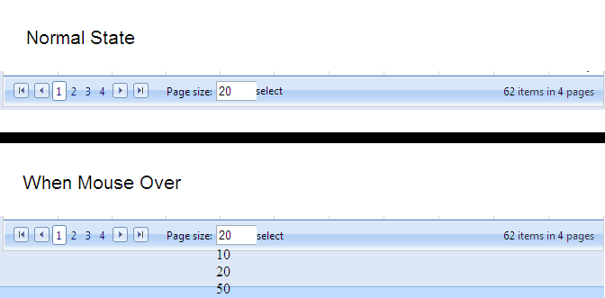 When using paging in RadGrid, instead of a page size dropdown I see a text - "Page size: | 20 | select" and when clicking on it it just overlays numbers: 10, 20, 50 and it becomes impossible to select those page numbers. To get a better idea what is the issue please take a look to an screen shot attached.