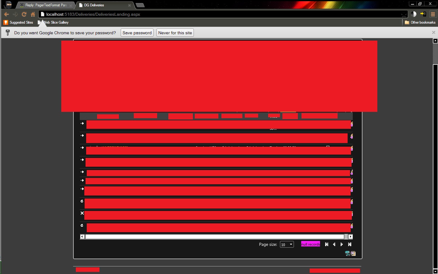 <PagerStyle Mode="NextPrevAndNumeric" AlwaysVisible="true" PagerTextFormat="{0} {1} {2} {3} {5} records {4} " />But what displays is "null records" with the controls to the right.