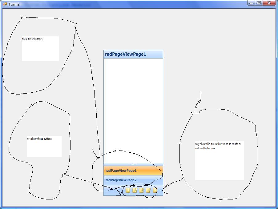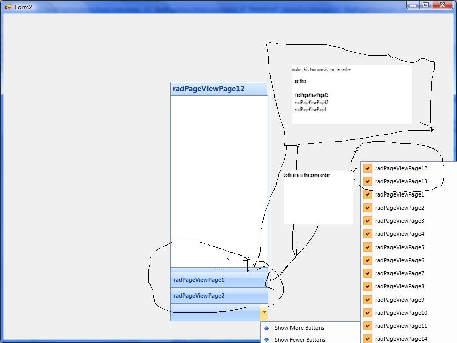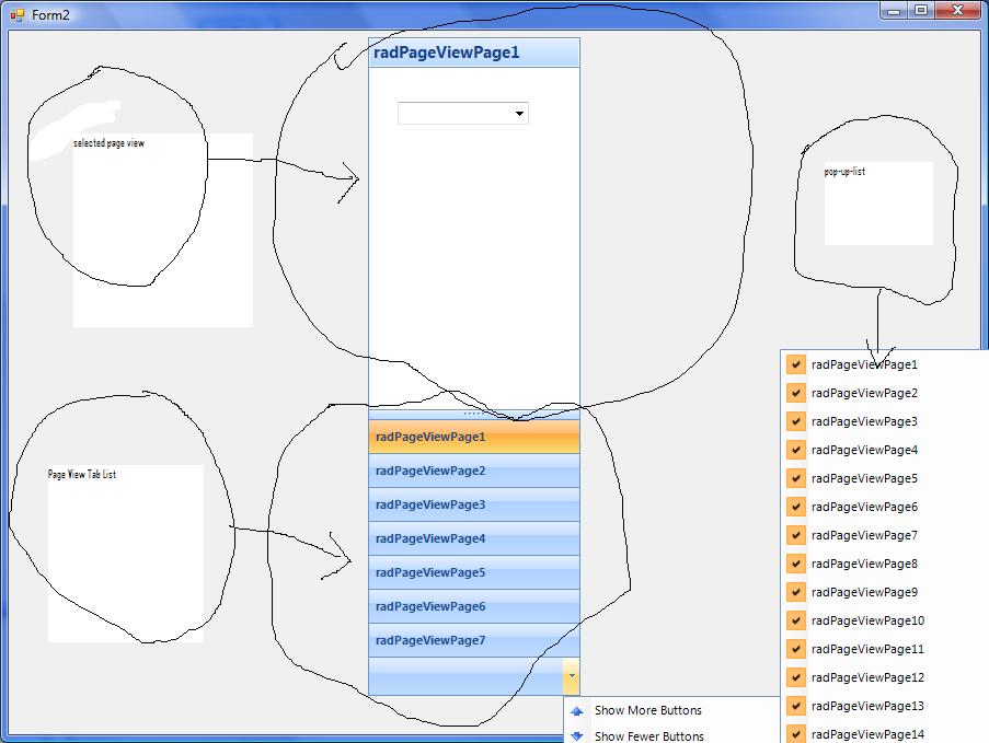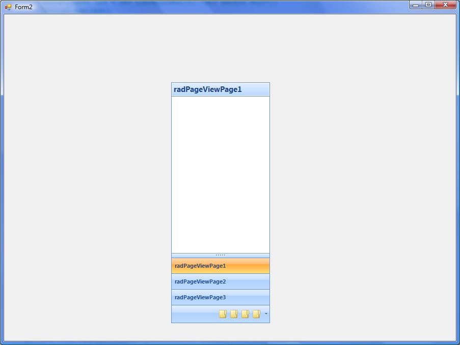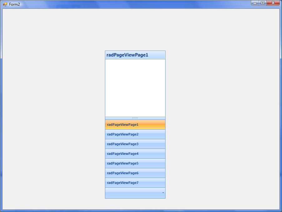 using System; using System.Collections.Generic; using System.ComponentModel; using System.Data; using System.Drawing; using System.Linq; using System.Text; using System.Windows.Forms; using Telerik.WinControls.UI; using Telerik.WinControls; //using Telerik.WinControls.RadControlSpy; namespace RadPageView_CS { public partial class Form1 : Form { public Form1() { InitializeComponent(); } private void Form1_Load(object sender, EventArgs e) { //RadControlSpyForm form = new RadControlSpyForm(); //form.Show(); this.radPageView1.SelectedPage = this.radPageViewPage1; RadPageViewOutlookElement outlookElement = this.radPageView1.ViewElement as RadPageViewOutlookElement; outlookElement.ItemCollapsed += new OutlookViewItemEventHandler(outlookElement_ItemCollapsed); outlookElement.DragGripDown(); outlookElement.DragGripDown(); outlookElement.DragGripDown(); outlookElement.DragGripDown(); outlookElement.DragGripDown(); //outlookElement.OverflowItemsContainer.AddRemoveButtonsItem.Visibility = Telerik.WinControls.ElementVisibility.Collapsed; this.radPageView1.SelectedPageChanged += new System.EventHandler(this.radPageView1_SelectedPageChanged); } void outlookElement_ItemCollapsed(object sender, OutlookViewItemEventArgs args) { RadPageViewOutlookElement outlookElement = this.radPageView1.ViewElement as RadPageViewOutlookElement; foreach (RadItem button in outlookElement.OverflowItemsContainer.Children[0].Children) { if (button is RadPageViewOutlookAssociatedButton) { button.AutoSize = false; button.Size = new Size(0, 0); } } } private void radPageView1_SelectedPageChanged(object sender, EventArgs e) { this.radPageView1.Pages.ChangeIndex(this.radPageView1.SelectedPage, 0); } } } You've also said there are 3 lists to be dealt with. I am only seeing 2, unless I have missed something obvious.