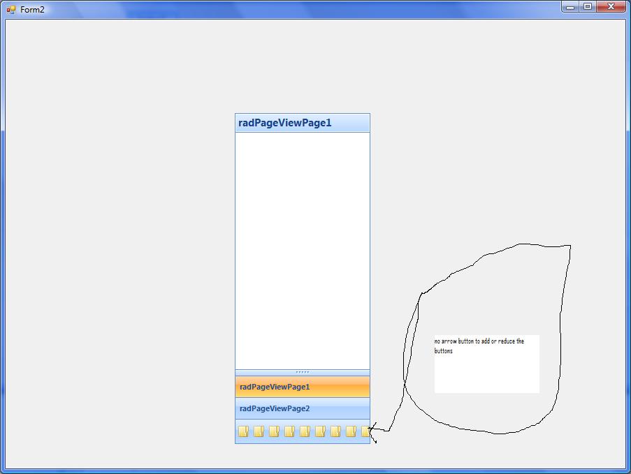 this.radPageView1.SelectedPage = this.radPageViewPage1; RadPageViewOutlookElement outlookElement = this.radPageView1.ViewElement as RadPageViewOutlookElement; outlookElement.DragGripDown(); outlookElement.DragGripDown(); outlookElement.DragGripDown(); outlookElement.DragGripDown(); outlookElement.DragGripDown(); outlookElement.OverflowItemsContainer.ShowFewerButtonsItem.Visibility = Telerik.WinControls.ElementVisibility.Collapsed; outlookElement.OverflowItemsContainer.ShowMoreButtonsItem.Visibility = Telerik.WinControls.ElementVisibility.Collapsed;hope that helps