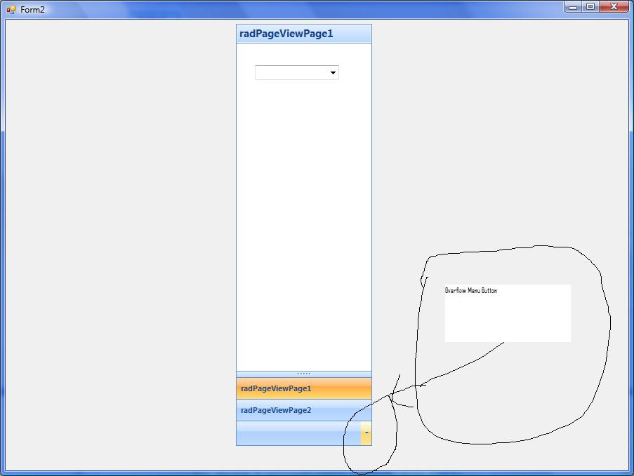 private void Form1_Load(object sender, EventArgs e) { RadControlSpyForm form = new RadControlSpyForm(); form.Show(); this.radPageView1.SelectedPage = this.radPageViewPage1; RadPageViewOutlookElement outlookElement = this.radPageView1.ViewElement as RadPageViewOutlookElement; outlookElement.ItemCollapsed += new OutlookViewItemEventHandler(outlookElement_ItemCollapsed); outlookElement.DragGripDown(); outlookElement.DragGripDown(); outlookElement.DragGripDown(); outlookElement.DragGripDown(); outlookElement.DragGripDown(); outlookElement.OverflowItemsContainer.AddRemoveButtonsItem.Visibility = Telerik.WinControls.ElementVisibility.Collapsed; } void outlookElement_ItemCollapsed(object sender, OutlookViewItemEventArgs args) { RadPageViewOutlookElement outlookElement = this.radPageView1.ViewElement as RadPageViewOutlookElement; foreach (RadItem button in outlookElement.OverflowItemsContainer.Children[0].Children) { if (button is RadPageViewOutlookAssociatedButton) { button.AutoSize = false; button.Size = new Size(0, 0); } } } Hope that helps but let me know if you need more information