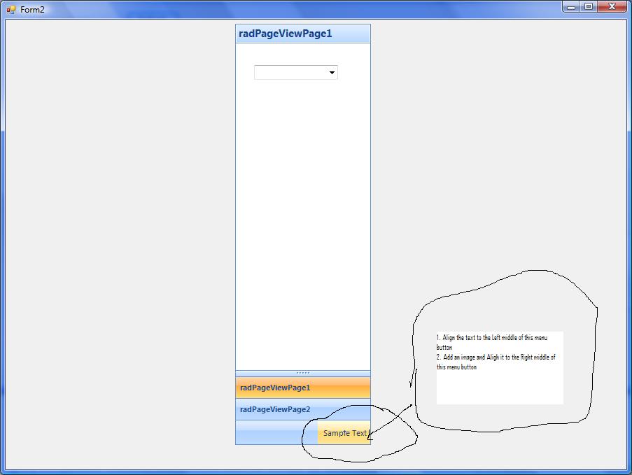 Telerik.WinControls.UI.RadPageViewOutlookElement outlookElement = this.radPageView1.ViewElement as Telerik.WinControls.UI.RadPageViewOutlookElement; outlookElement.OverflowItemsContainer.OverflowButtonElement.ImageAlignment = ContentAlignment.MiddleRight; outlookElement.OverflowItemsContainer.OverflowButtonElement.TextAlignment = ContentAlignment.MiddleLeft; outlookElement.OverflowItemsContainer.OverflowButtonElement.Text = "Sample Text"; Any suggestion to help us to get what we want here?