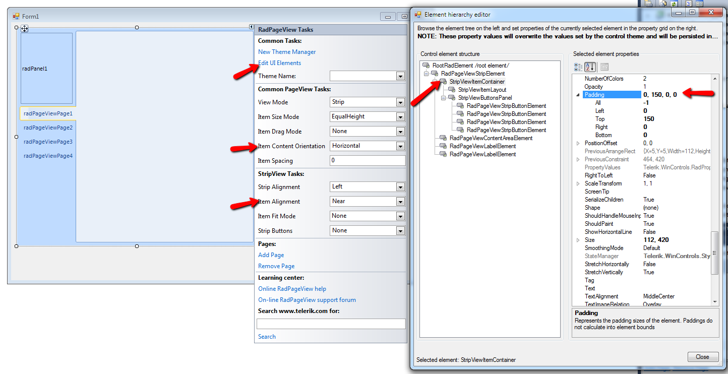 To achieve this scenario, you can set Padding to the ItemsPanel of RadPageView and then place a RadPanel in the free space. I am enclosing a sample project which demonstrates this. I am also attaching a screenshot which demonstrates the settings you need to make. Note that RadPageView does not allow child controls of types other than RadPageViewPage. Therefore, I have added the RadPanel to the free space on the form, used the Bring to Front menu item from the context menu, and then used the arrow keys to place the panel properly. This way the panel is added to the form's child controls but it appears over the page view.