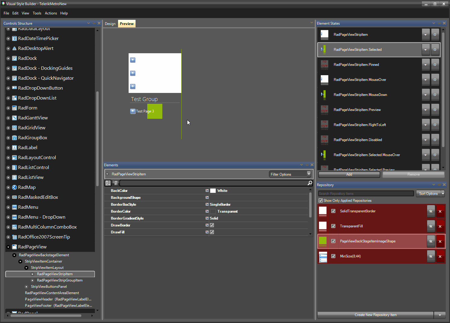 5. Go to 'Element states' window for customization needed states for item. In my case I am looking all states where green arrow image is used. There are 'RadPageViewStripItem.Selected','RadPageViewStripItem.MouseDown' and 'RadPageViewStripItem.Selected.MouseOver'.
