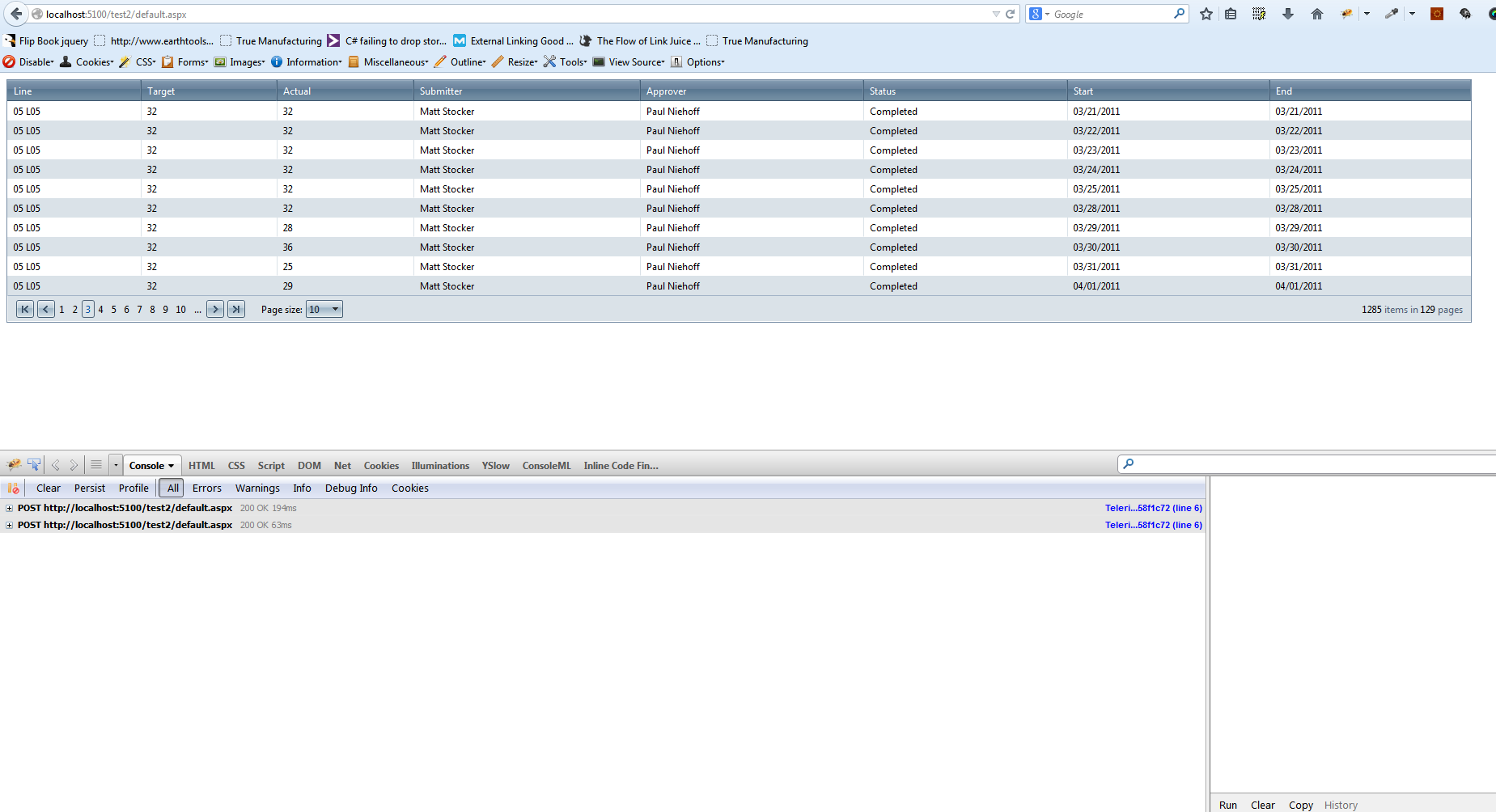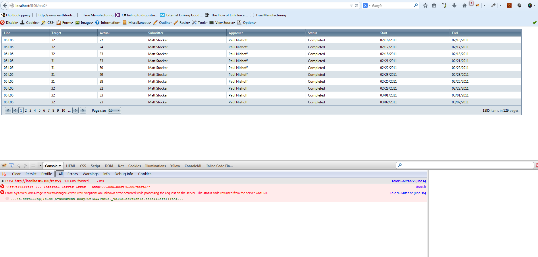 protected void CompletedLineProductionGoalGrid_NeedDataSource(object sender, EventArgs e){ GetDataSource(); List<LineProductionGoal> myCompletedGoals = new List<LineProductionGoal>(); myCompletedGoals.AddRange(listOfGoals.Where(i => i.StatusID == 5)); CompletedLineProductionGoalGrid.DataSource = myCompletedGoals.OrderBy(i => i.LineName);}private void GetDataSource(){ if (listOfGoals == null) { listOfGoals = new LineProductionGoal().SelectAllLineProductionGoalsByUserIDNotDeleted(((User)Session["User"]).UserID); }}<telerik:RadGrid ID="CompletedLineProductionGoalGrid" runat="server"> <MasterTableView> <Columns> <telerik:GridBoundColumn DataField="LineName" HeaderText="Line" UniqueName="LineName" /> <telerik:GridBoundColumn DataField="TargetUnitCount" HeaderText="Target" UniqueName="TargetUnitCount" /> <telerik:GridBoundColumn DataField="ActualUnitCount" HeaderText="Actual" UniqueName="ActualUnitCount" /> <telerik:GridBoundColumn DataField="SubmittedByName" HeaderText="Submitter" UniqueName="SubmittedByName" /> <telerik:GridBoundColumn DataField="ApprovedByName" HeaderText="Approver" UniqueName="ApprovedByName" /> <telerik:GridBoundColumn DataField="StatusType" HeaderText="Status" UniqueName="LineStatusType" /> <telerik:GridDateTimeColumn DataField="StartDate" DataFormatString="{0:MM/dd/yyyy}" HeaderText="Start" UniqueName="StartDate" /> <telerik:GridDateTimeColumn DataField="EndDate" DataFormatString="{0:MM/dd/yyyy}" HeaderText="End" UniqueName="EndDate" /> </Columns> </MasterTableView></telerik:RadGrid>What happens is that if I put in the full url (http://localhost:5100/test/default.aspx) then everything works as expected. However if I go to (http://localhost:5100/test/) then it throws an error. Has anyone seen this behavior before.
