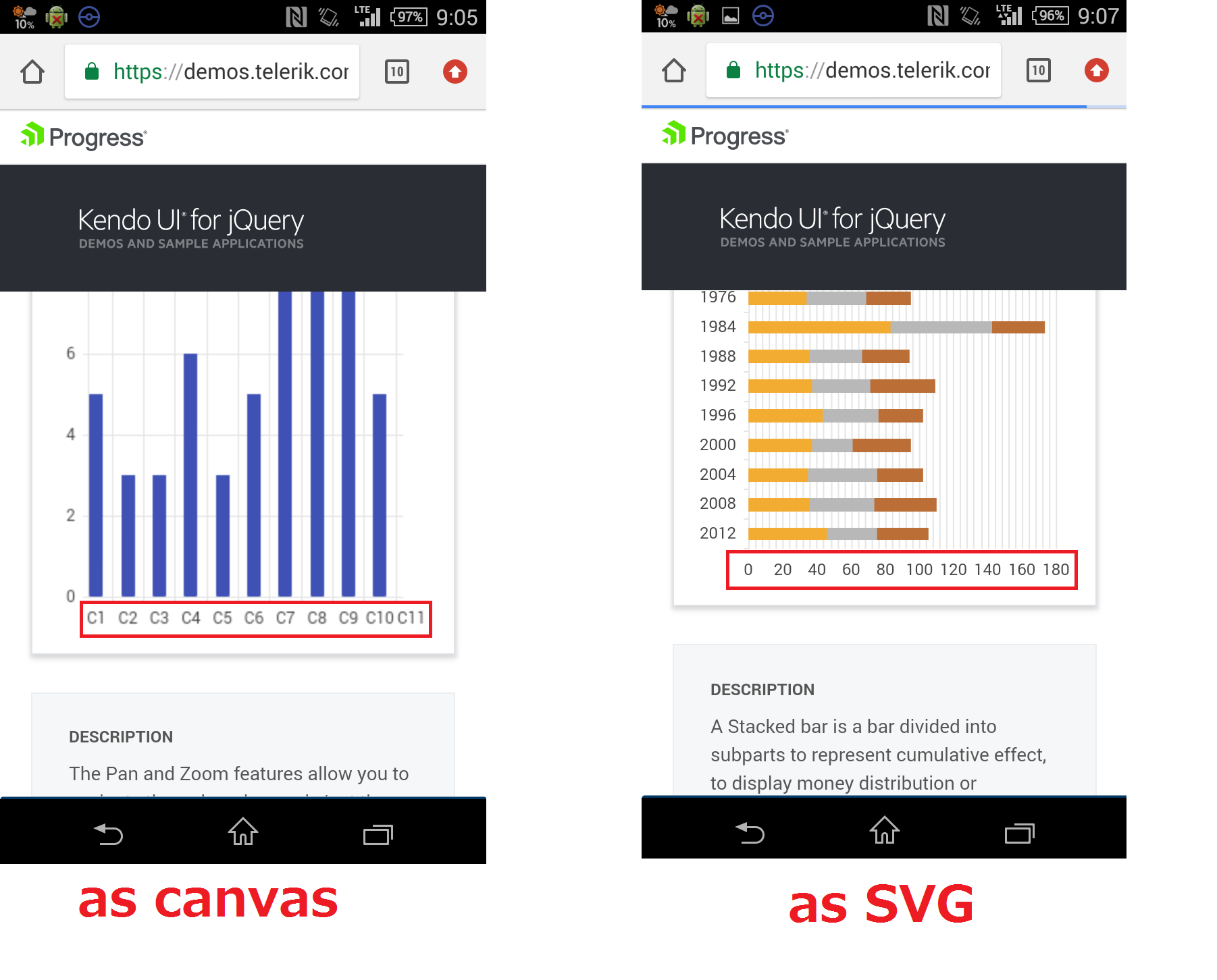 As far as I understand you are having some problems with blurring characters under mobile devices when Chart is rendered as canvas and pan/zoom is used. I tested our https://demos.telerik.com/kendo-ui/bar-charts/pan-and-zoom demo under mobile phone and it worked fine. Could you please provide more information about the issue you are facing?