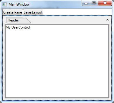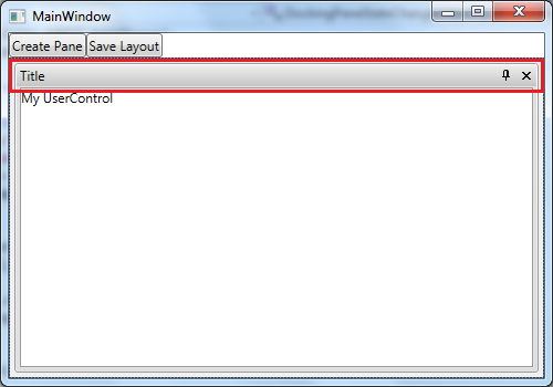 using System;using System.Collections.Generic;using System.IO;using System.Linq;using System.Text;using System.Threading.Tasks;using System.Windows;using System.Windows.Controls;using System.Windows.Data;using System.Windows.Documents;using System.Windows.Input;using System.Windows.Media;using System.Windows.Media.Imaging;using System.Windows.Navigation;using System.Windows.Shapes;using Telerik.Windows.Controls;namespace NoDocumentHost{ /// <summary> /// Interaction logic for DockingUC.xaml /// </summary> public partial class DockingUC : UserControl { public DockingUC() { InitializeComponent(); } public void CreatePane() { RadSplitContainer l_splitContainer = new RadSplitContainer(); RadPaneGroup l_paneGroup = new RadPaneGroup(); l_splitContainer.Items.Add(l_paneGroup); m_docking.Items.Add(l_splitContainer); RadPane l_pane = new RadPane() { CanUserPin = true, Title = "Title", Header = "Header", CanUserClose = true, ContextMenuTemplate = null }; UserControl1 l_userControl = new UserControl1(); l_pane.Content = l_userControl; l_paneGroup.Items.Add(l_pane); l_pane.MakeFloatingDockable(); } private void DockingPaneStateChange(object p_sender, Telerik.Windows.RadRoutedEventArgs p_args) { Dispatcher.BeginInvoke(new Action(() => { RadPane l_pane = (RadPane)p_args.OriginalSource; RadPaneGroup l_paneGroup = l_pane.PaneGroup; l_paneGroup.TabStripPlacement = Dock.Top; })); } }}A floating Pane is created when the user clicks the "Create button".