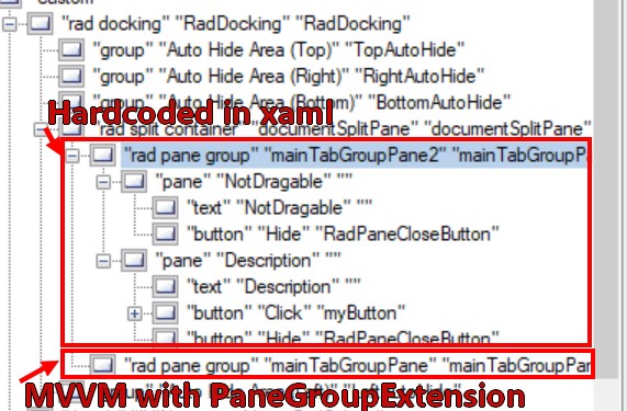 <telerik:RadDocking HasDocumentHost="False"> <telerik:RadSplitContainer> <telerik:RadPaneGroup > <telerik:RadPane Header="Pane" IsPinned="False" CanUserClose="False" CanFloat="False"> <Grid> </Grid> </telerik:RadPane> </telerik:RadPaneGroup> <telerik:RadPaneGroup local:PaneGroupExtensions.ItemsSource="{Binding ForExtension}" /> </telerik:RadSplitContainer> </telerik:RadDocking>