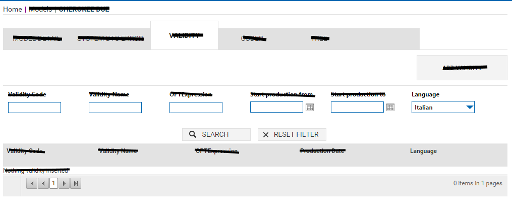 <telerik:RadPageView ID="rpwValidity" runat="server"> <div class="divFilters"> <telerik:RadPanelBar runat="server" ID="pnlBarFilterValidity" Width="100%" ExpandMode="MultipleExpandedItems" Font-Bold="true"> <Items> <telerik:RadPanelItem Expanded="false"> <HeaderTemplate></HeaderTemplate> <ContentTemplate> <div class="filterBox"> <div class="filterItemContainer"> <div class="filterItem"> <asp:Label ID="lblTagFilterValidityCode" runat="server" SkinID="TagFilter" CssClass="filterLabel" /> <telerik:RadTextBox ID="txtValidityCodeFilter" runat="server" MaxLength="16" Width="100px" /> </div> <div class="filterItem"> <asp:Label ID="lblTagFilterValidityName" runat="server" SkinID="TagFilter" CssClass="filterLabel" /> <telerik:RadTextBox ID="txtValidityNameFilter" runat="server" MaxLength="16" Width="180px" /> </div> <div class="filterItem"> <asp:Label ID="lblTagFilterOPTExpression" runat="server" SkinID="TagFilter" CssClass="filterLabel" /> <telerik:RadTextBox ID="txtOPTExpressionFilter" runat="server" MaxLength="16" Width="180px" /> </div> <div class="filterItem"> <asp:Label ID="lblTagFilterStartProductionDateFrom" runat="server" SkinID="TagFilter" CssClass="filterLabel" /> <telerik:RadDatePicker ID="rdpStartProductionDateFromFilter" runat="server" Width="180px" AutoPostBack="true" OnSelectedDateChanged="rdpStartProductionDateFromFilter_SelectedDateChanged" /> </div> <div class="filterItem"> <asp:Label ID="lblTagFilterStartProductionDateTo" runat="server" SkinID="TagFilter" CssClass="filterLabel" /> <telerik:RadDatePicker ID="rdpStartProductionDateToFilter" runat="server" Width="180px" AutoPostBack="true" OnSelectedDateChanged="rdpStartProductionDateToFilter_SelectedDateChanged" /> </div> <div class="filterItem"> <asp:Label ID="lblTagFilterLanguage" runat="server" SkinID="TagFilter" CssClass="filterLabel" /> <telerik:RadComboBox ID="ddlLanguageFilter" runat="server" Width="120px" /> </div> </div> <div class="filterButton"> <telerik:RadButton ID="btnSearchValidity" runat="server" Width="140px" Height="65px" Font-Bold="true" Font-Size="16px" ForeColor="#0167B1" OnClick="btnSearchValidity_Click"> <Icon PrimaryIconUrl="~/Images/24x24/search.png" PrimaryIconHeight="24px" PrimaryIconWidth="24px" /> </telerik:RadButton> <telerik:RadButton ID="btnResetFilterValidity" runat="server" Width="140px" Height="35px" Font-Bold="true" Font-Size="16px" ForeColor="Red" OnClick="btnResetFilterValidity_Click" Skin="Sunset"> </telerik:RadButton> </div> </div> </ContentTemplate> </telerik:RadPanelItem> </Items> </telerik:RadPanelBar> </div> <telerik:RadGrid ID="gvListValidity" runat="server" AllowPaging="True" ......
