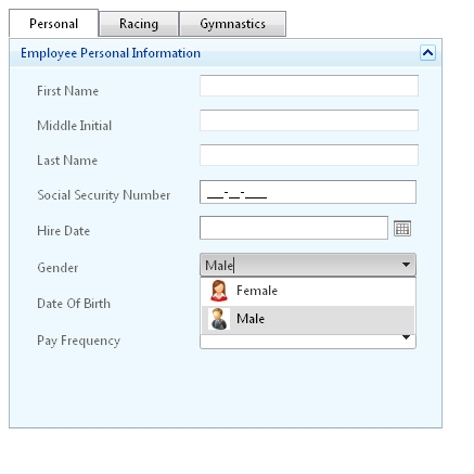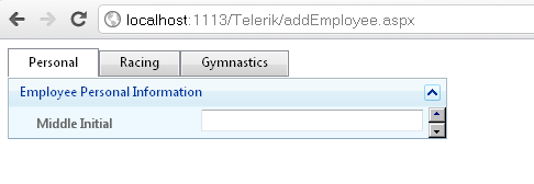 <%@ Page Language="C#" AutoEventWireup="true" CodeFile="addEmployee.aspx.cs" Inherits="addEmployee" %><%@ Register Assembly="Telerik.Web.UI" Namespace="Telerik.Web.UI" TagPrefix="telerik" %><!DOCTYPE html PUBLIC "-//W3C//DTD XHTML 1.0 Transitional//EN" "http://www.w3.org/TR/xhtml1/DTD/xhtml1-transitional.dtd"><html xmlns="http://www.w3.org/1999/xhtml"><head runat="server"> <title></title> <link href="TabStrip.Vista.css" rel="stylesheet" type="text/css" /> <link href="PanelBar.Office2010Silver.css" rel="stylesheet" type="text/css" /> <link href="PanelBar.Vista.css" rel="stylesheet" type="text/css" /> <link rel="stylesheet" type="text/css" href="StyleSheet.css" /> <link href="ComboBox.Office2010Silver.css" rel="stylesheet" type="text/css" /></head><body> <form id="form1" runat="server"> <telerik:RadScriptManager ID="RadScriptManager1" runat="server"> </telerik:RadScriptManager> <telerik:RadAjaxManager runat="server" ID="RadAjaxManager1"> <AjaxSettings> <telerik:AjaxSetting AjaxControlID="RadTabStrip1"> <UpdatedControls> <telerik:AjaxUpdatedControl ControlID="RadTabStrip1" /> <telerik:AjaxUpdatedControl ControlID="RadMultiPage1" /> </UpdatedControls> </telerik:AjaxSetting> </AjaxSettings> </telerik:RadAjaxManager> <telerik:RadTabStrip ID="RadTabStrip1" runat="server" MultiPageID="RadMultiPage1" UnSelectChildren="True" Skin="Vista" EnableEmbeddedSkins="false" ClickSelectedTab="True" AutoPostBack="True" SelectedIndex="0"> <Tabs> <telerik:RadTab runat="server" Text="Personal" Selected="True" PageViewID="RadPageView1"> </telerik:RadTab> <telerik:RadTab runat="server" Text="Racing" PageViewID="RadPageView5"> <Tabs> <telerik:RadTab Text="Running" PageViewID="RadPageView6" /> <telerik:RadTab Text="Swimming" PageViewID="RadPageView7" /> <telerik:RadTab Text="Skiing" PageViewID="RadPageView8" /> </Tabs> </telerik:RadTab> <telerik:RadTab runat="server" Text="Gymnastics" PageViewID="RadPageView9"> <Tabs> <telerik:RadTab Text="Vault" PageViewID="RadPageView10" /> <telerik:RadTab Text="Uneven Bars" PageViewID="RadPageView11" /> <telerik:RadTab Text="Balance Beam" PageViewID="RadPageView12" /> </Tabs> </telerik:RadTab> </Tabs> </telerik:RadTabStrip> <telerik:RadMultiPage ID="RadMultiPage1" runat="server" SelectedIndex="0"> <telerik:RadPageView ID="RadPageView1" runat="server"> <telerik:RadAjaxPanel ID="RadAjaxPanel1" runat="server"> <telerik:RadPanelBar runat="server" ID="RadPanelBar1" ExpandMode="FullExpandedItem" Skin="Vista" EnableEmbeddedSkins="false" Width="400px"> <Items> <telerik:RadPanelItem Expanded="true" Text="Employee Personal Information" runat="server" Selected="true"> <Items> <telerik:RadPanelItem Value="AccountInformation" runat="server"> <ItemTemplate> <div class="text" style="background-color: #edf9fe"> <ul class="formList" id="accountInfo"> <li> <asp:Label Width="150px" runat="server" ID="lblFirstName" AssociatedControlID="accountName">First Name</asp:Label> <asp:TextBox ID="accountName" CssClass="textInput" runat="server" ValidationGroup="accountValidation" Width="200px"></asp:TextBox> <asp:RequiredFieldValidator runat="server" ID="rqrdName" ValidationGroup="accountValidation" ControlToValidate="accountName" ErrorMessage="First name is required" Text="*"></asp:RequiredFieldValidator> </li> <li> <asp:Label runat="server" Width="150px" ID="lblMiddle" AssociatedControlID="txtMiddle">Middle Initial</asp:Label> <asp:TextBox ID="txtMiddle" CssClass="textInput" runat="server" Width="200px"></asp:TextBox> </li> <li> <asp:Label runat="server" Width="150px" ID="lblLastName" AssociatedControlID="txtLastName">Last Name</asp:Label> <asp:TextBox CssClass="textInput" ValidationGroup="accountValidation" ID="txtLastName" runat="server" Width="200px"></asp:TextBox> <asp:RequiredFieldValidator runat="server" ValidationGroup="accountValidation" ID="rqrdLast" ControlToValidate="txtLastName" ErrorMessage="LastName is required" Text="*"></asp:RequiredFieldValidator> </li> <li> <asp:Label runat="server" ID="lblSSN" AssociatedControlID="txtSSN" Width="150px">Social Security Number</asp:Label> <telerik:RadMaskedTextBox Mask="###-##-####" runat="server" ID="txtSSN" Width="200px" ValidationGroup="accountValidation"> </telerik:RadMaskedTextBox> <asp:RequiredFieldValidator runat="server" ValidationGroup="accountValidation" ID="rqrdSSN" ControlToValidate="txtSSN" ErrorMessage="SSN is required" Text="*"></asp:RequiredFieldValidator> </li> <li> <asp:Label runat="server" ID="lblHireDate" AssociatedControlID="radDtHiredate" Width="150px">Hire Date</asp:Label> <telerik:RadDatePicker ID="radDtHiredate" Width="200px" runat="server" MinDate="1900-01-01" AutoPostBack="true"> <Calendar ID="calHire" RangeMinDate="1900-01-01" runat="server"> </Calendar> </telerik:RadDatePicker> </li> <li> <asp:Label runat="server" ID="lblGender" AssociatedControlID="RadComboBox1" Width="150px">Gender</asp:Label> <telerik:RadComboBox ID="RadComboBox1" AutoPostBack="true" CssClass="ComboBox" runat="server" Width="200px"> </telerik:RadComboBox> </li> <li> <asp:Label runat="server" ID="lblDob" AssociatedControlID="radDtDOB" Width="150px">Date Of Birth</asp:Label> <telerik:RadDatePicker ID="radDtDOB" Width="200px" runat="server" MinDate="1900-01-01" AutoPostBack="true"> <Calendar ID="calDob" RangeMinDate="1900-01-01" runat="server"> </Calendar> </telerik:RadDatePicker> </li> <li> <asp:Label runat="server" ID="lblPayFrequency" AssociatedControlID="radPayFrequency" Width="150px">Pay Frequency</asp:Label> <telerik:RadComboBox ID="radPayFrequency" AutoPostBack="true" CssClass="ComboBox" runat="server" Width="200px"> </telerik:RadComboBox> </li> </ul> <br /> <asp:ValidationSummary runat="server" ID="validationSummary" CssClass="validationSummary" /> <br /> <br /> </div> </ItemTemplate> </telerik:RadPanelItem> </Items> </telerik:RadPanelItem> </Items> </telerik:RadPanelBar> </telerik:RadAjaxPanel> </telerik:RadPageView> <telerik:RadPageView ID="RadPageView2" runat="server"> <h3 class="title"> Court sports: Tennis</h3> Tennis is a sport played between two
