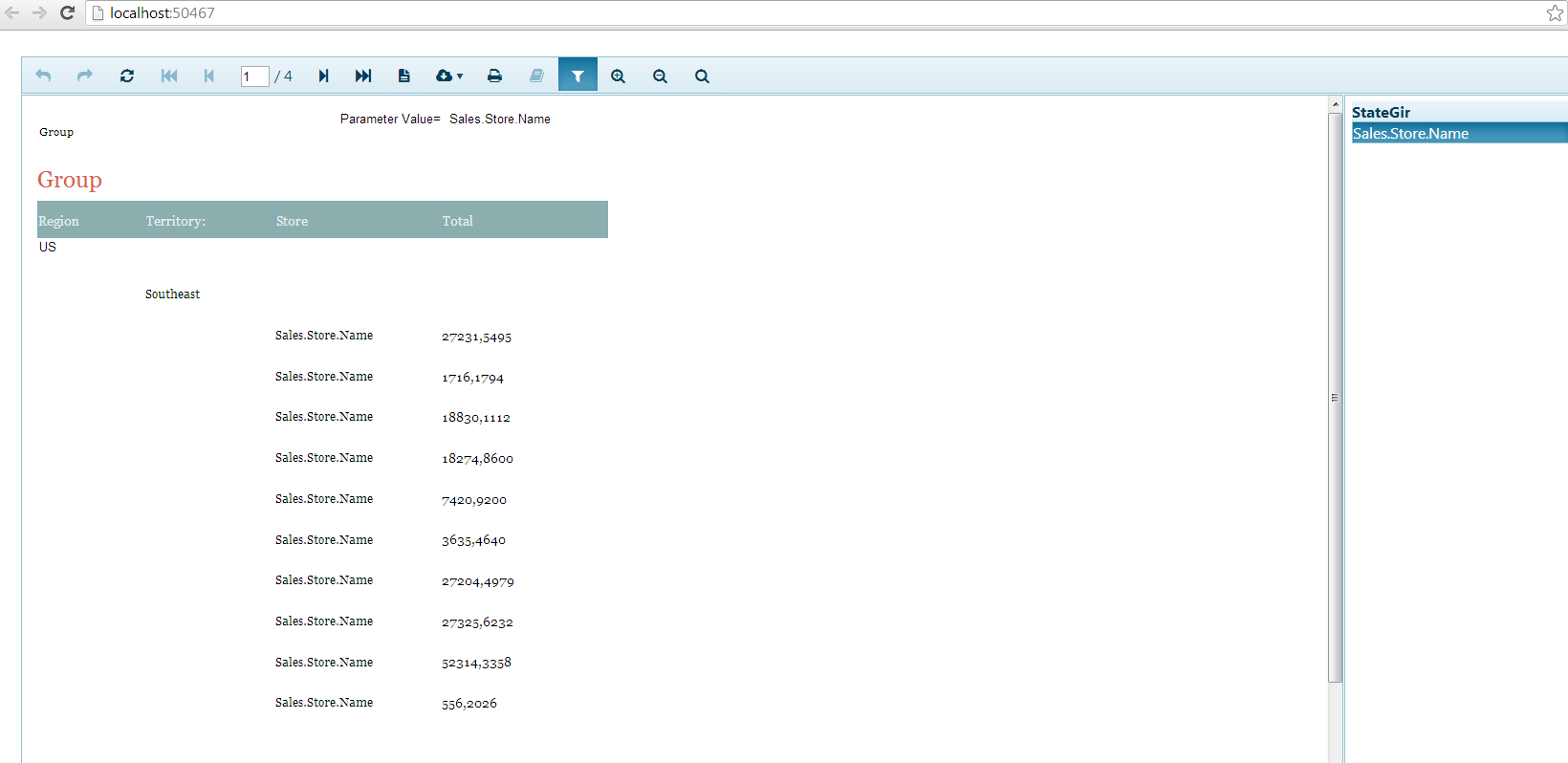 <div id="reportViewer1" class="k-widget"> loading... </div> <script type="text/javascript"> $reportViewer = $("#reportViewer1") .telerik_ReportViewer({ serviceUrl: "/api/reports/", templateUrl: '/ReportViewer/templates/telerikReportViewerTemplate.html div.trv-report-viewer', reportSource: { report: "MyClassLib.Group, MyClassLib" }, viewMode: telerikReportViewer.ViewMode.Interactive, scaleMode: telerikReportViewer.ScaleModes.SPECIFIC, scale: 1.0 }); </script>**Parameter settings**