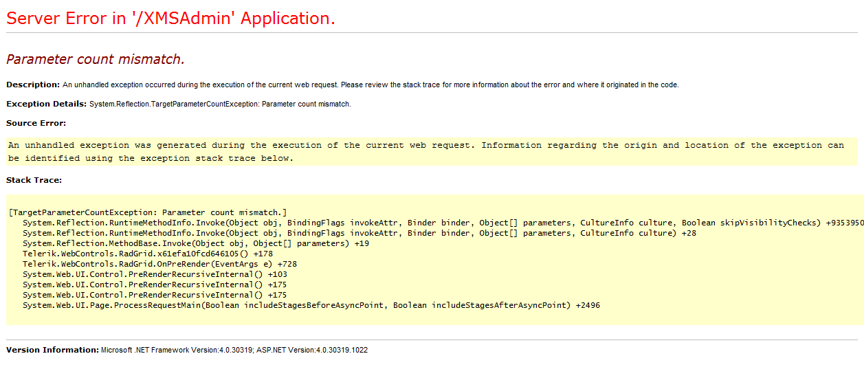 When we are running the project in 4.0 of the VS2010, we got the following error like "Parameter count mismatch."