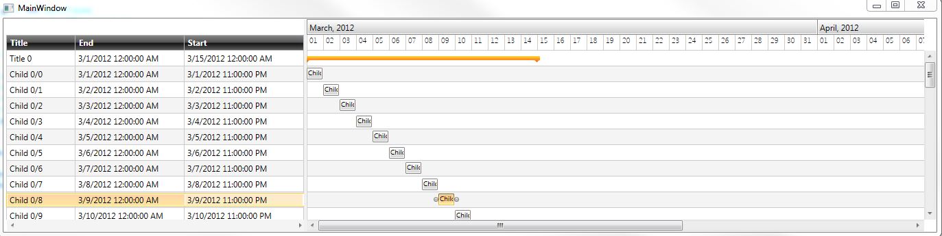 <Window x:Class="GanttChart.MainWindow" Title="MainWindow" Height="350" Width="525" xmlns:telerik="http://schemas.telerik.com/2008/xaml/presentation"> <Grid> <telerik:RadGanttView Margin="0" Name="radGanttView1" VerticalAlignment="Stretch" HorizontalAlignment="Stretch"> <telerik:RadGanttView.Columns> <telerik:ColumnDefinition ColumnWidth="175" Header="Title" MemberBinding="{Binding Title}" /> <telerik:ColumnDefinition ColumnWidth="175" Header="End" MemberBinding="{Binding Start}"/> <telerik:ColumnDefinition ColumnWidth="175" Header="Start" MemberBinding="{Binding End}"/> </telerik:RadGanttView.Columns> </telerik:RadGanttView> </Grid></Window>using System;using System.Collections.Generic;using System.Collections.ObjectModel;using System.Linq;using System.Text;using System.Windows;using System.Windows.Controls;using System.Windows.Data;using System.Windows.Documents;using System.Windows.Input;using System.Windows.Media;using System.Windows.Media.Imaging;using System.Windows.Navigation;using System.Windows.Shapes;using Telerik.Windows.Controls.GanttView;using Telerik.Windows.Controls.Scheduling;namespace GanttChart{ /// <summary> /// Interaction logic for MainWindow.xaml /// </summary> public partial class MainWindow : Window { public MainWindow() { InitializeComponent(); var d = new DateTime(2012, 3, 1); radGanttView1.VisibleRange = new VisibleRange(d, d.AddMonths(2)); var tasks = new ObservableCollection<GanttTask>(); for (int i = 0; i < 4; i++) { var gt = new GanttTask( d.AddDays(14 * i), d.AddDays(14 * i + 14), "Title " + i.ToString()); for (int j = 0; j < gt.Duration.Days; j++) { var childGT = new GanttTask(); childGT.Start = gt.Start.AddDays(j); childGT.End = childGT.Start.AddHours(23); childGT.Title = "Child " + i.ToString() + "/" + j.ToString(); gt.Children.Add(childGT); } tasks.Add(gt); } radGanttView1.TasksSource = tasks; radGanttView1.PixelLength = new TimeSpan(0, 1, 0, 0); } }}