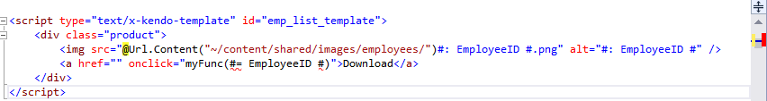 <a href="" onclick="myFunc(#=EmployeeID#)">Download</a>However, if the EmployeeID is a string, I would recommend passing the button itself to the function and determining the item which was clicked with the help of the dataItem() method instead: