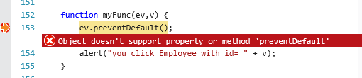 <a href="" onclick="myFunc(event, #= id #)">Download Employee Info</a>function myFunc(ev, v) { ev.preventDefault(); alert("you click Employee with id= " + v);}Regards,