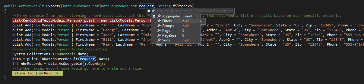 I have a page that has a grid and some filter fields (external from the grid). The filtering gets applied to the grid in the JavaScript - which works fine. I also have an export button that I need to export the data in my grid - since my grid does not contain all the data that my export needs, my thought was to pass the DataSourceRequest as a parameter to my Ajax call, select my data and then use the "toDataSourceResult()" as happens in my ajax read controller action. This is not working.