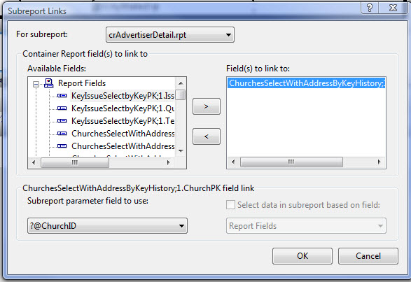 But inside the subreport you don't have the ability to hardcode the parameter so I'm not sure how to get the value to an identical type SelectCommand in the subreport. I've set a ReportParameter in the subreport called KeyPK, the main report then sets the subreport with KeyPK = =Parameters.[@KeyPK], I've put a break in the subreport after the InitializeComponent and the parameter is not set to the new value.