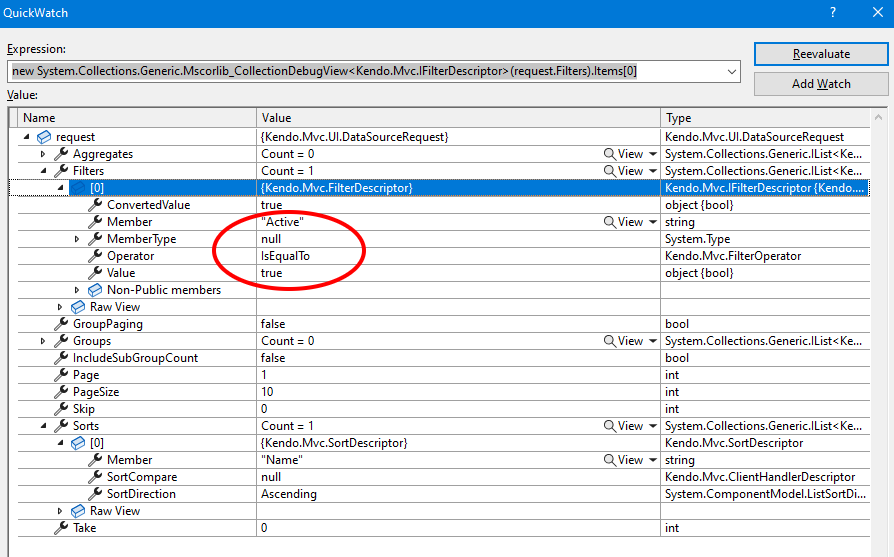 }In the next picture you can see the request object on the controller in debug mode with the default parameters defined in the view: