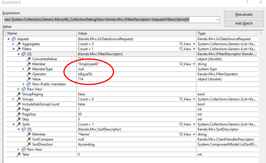 http://localhost:51068/Admin/Employees_Read?employees-filter=EmployeeID~eq~714and let me know whether the issue persists.