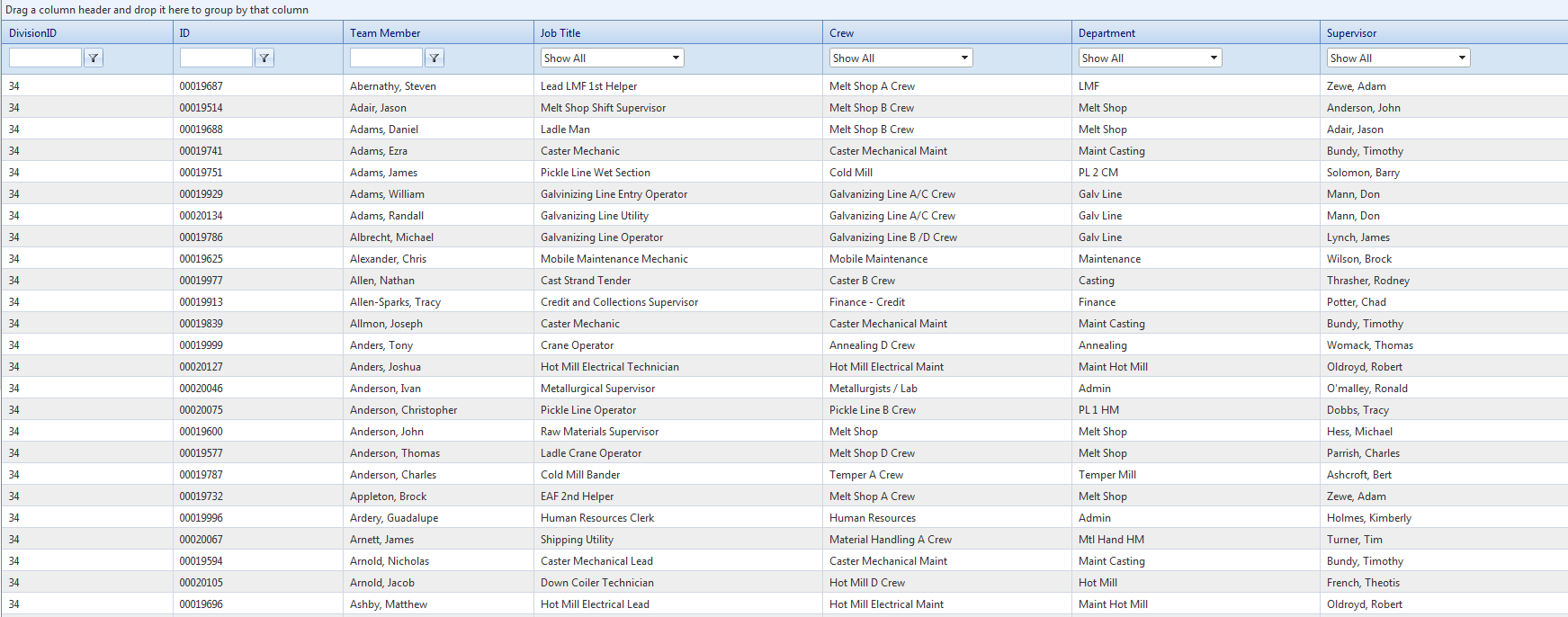<telerik:RadGrid ID="uxEmpGrid" runat="server" AutoGenerateColumns="false" AllowSorting="True" GroupingEnabled="true" ShowGroupPanel="true" Skin="Office2007" AlternatingItemStyle-BackColor="#EEEEEE" GridLines="None" ShowFooter="true" AllowPaging="true" PageSize="200" AllowFilteringByColumn="true"> <GroupingSettings ShowUnGroupButton="true" CaseSensitive="false" /> <ClientSettings AllowDragToGroup="true"></ClientSettings> <MasterTableView DataKeyNames="DivisionID"> <Columns> <telerik:GridBoundColumn DataField="DivisionID" HeaderText="DivisionID" Groupable="false"></telerik:GridBoundColumn> <telerik:GridBoundColumn DataField="SAPEmpNum" HeaderText="ID" Groupable="false"></telerik:GridBoundColumn> <telerik:GridBoundColumn DataField="FullNameLastNameFirst" HeaderText="Team Member" ></telerik:GridBoundColumn> <nu:SAPPositionFilterColumn DataField="SAPPosition" HeaderText="Job Title" UniqueName="SAPPosition"> <Itemtemplate> <%# Eval("SAPPosition") %> </Itemtemplate> </nu:SAPPositionFilterColumn> <nu:SAPCrewFilterColumn DataField="SAPCrew" HeaderText="Crew" UniqueName="SAPCrew"> <Itemtemplate> <%# Eval("SAPCrew") %> </Itemtemplate> </nu:SAPCrewFilterColumn> <nu:SAPDepartmentFilterColumn DataField="SAPDepartment" HeaderText="Department" UniqueName="SAPDepartment"> <Itemtemplate> <%# Eval("SAPDepartment") %> </Itemtemplate> </nu:SAPDepartmentFilterColumn> <nu:SAPSupervisorFilterColumn DataField="SAPSupervisorNameLastNameFirst" HeaderText="Supervisor" UniqueName="SAPSupervisorNameLastNameFirst"> <Itemtemplate> <%# Eval("SAPSupervisorNameLastNameFirst") %> </Itemtemplate> </nu:SAPSupervisorFilterColumn> </Columns> </MasterTableView></telerik:RadGrid>protected override void SetupFilterControls(TableCell cell){ var masterTableView = this.Owner;