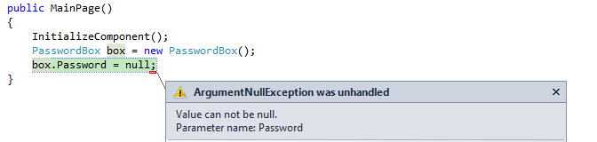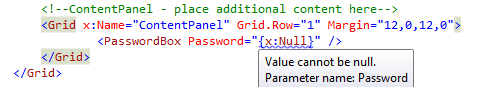 The default passwordbox does not throw an exception or crash when I use null as my default value. However the telerik version does. It's easy to fix my making the default the empty string but I feel as though it should have the same behavior. Here is the exception data for your reference.