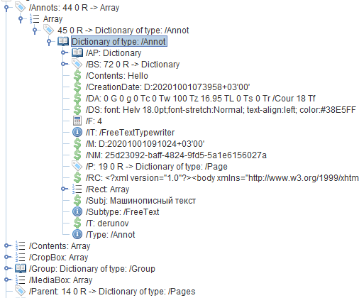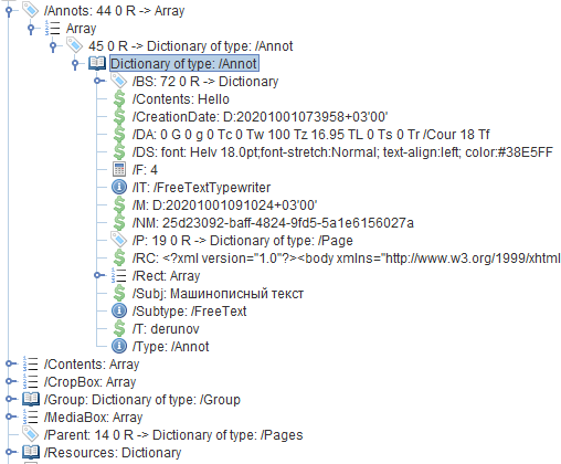We tried to find easy solution for this, but we understand that we will have to create AP entry for each type of 'Markup annotations' to PdfViewer can display them. Could you tell us, is it possible to read raw data of every annotation through model of RadFixedDocument? I mean, for example for free text - DA, DS, RC entries to generate the annotation appearance