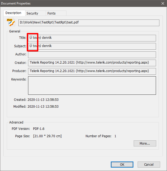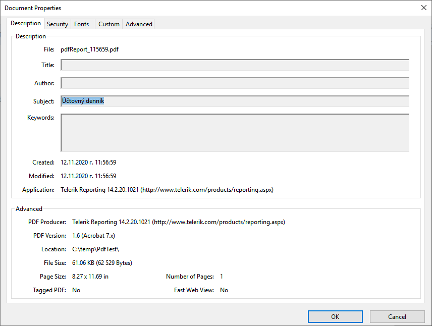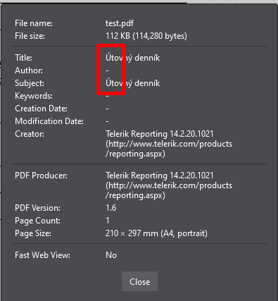 I'm sorry to hear you're still having troubles with the encoding of the PDF subject. Thanks for attaching a sample report - I examined it, but I was unable to find a problem in the subject field contents on my side. When I open the produced test.pdf file, its subject field seems OK to me, as it shows Účtovný denník, as expected.