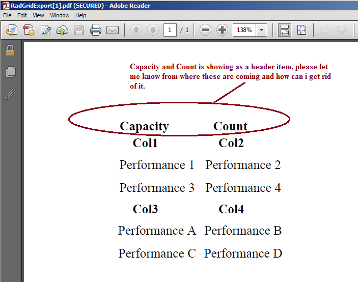 I'm using arraylist for my wrapper grid to bind the child grids in order to export pdf but data is getting exported in pdf file with two header items "Capacity" and "Count", not sure from where these are coming.