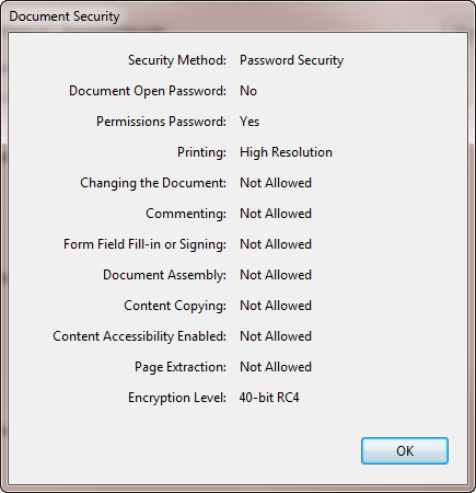 I can't find anywhere what Telerik is using as the default password on PDF export if you don't define one. The attached is a screen-shot from Adobe Reader regarding the default settings.