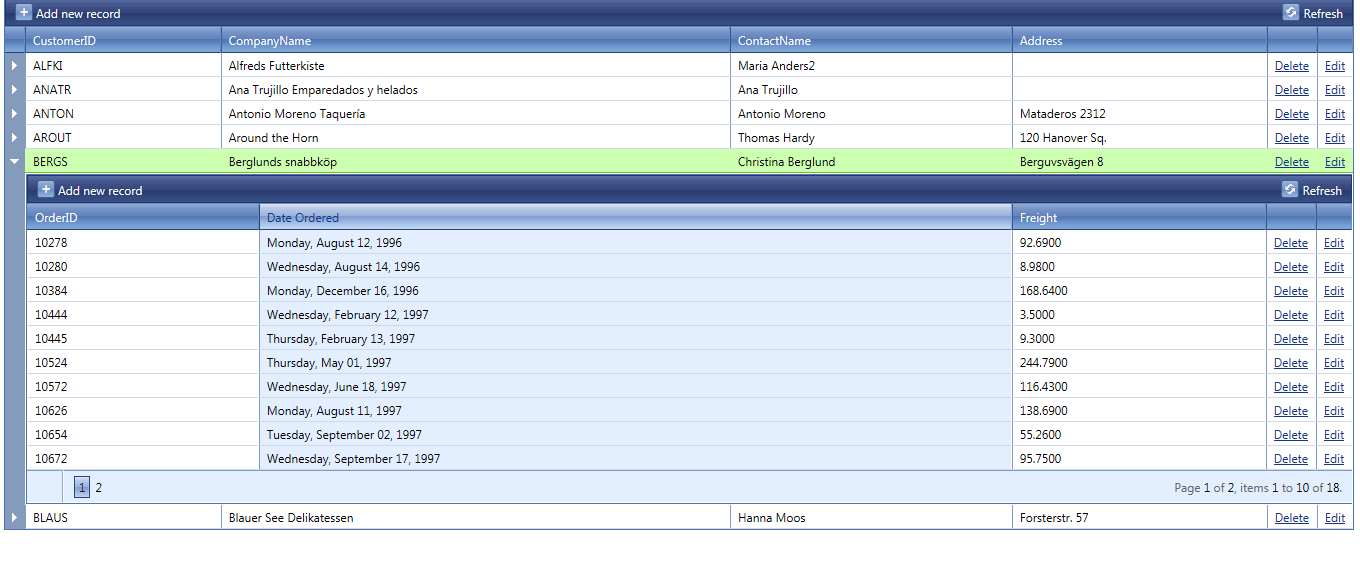 <%@ Page Language="C#" AutoEventWireup="true" CodeFile="Default.aspx.cs" Inherits="_Default" %><%@ Register TagPrefix="telerik" Assembly="Telerik.Web.UI" Namespace="Telerik.Web.UI" %><!DOCTYPE html PUBLIC "-//W3C//DTD XHTML 1.0 Transitional//EN" "http://www.w3.org/TR/xhtml1/DTD/xhtml1-transitional.dtd"><html xmlns="http://www.w3.org/1999/xhtml"><head id="Head1" runat="server"> <title></title></head><body> <form id="form1" runat="server"> <asp:ScriptManager runat="server" ID="ScriptManager1" /> <div> <telerik:RadGrid Skin="Web20" ID="RadGrid1" ShowStatusBar="True" DataSourceID="SqlDataSource1" runat="server" AutoGenerateColumns="False" AllowPaging="True" AllowMultiRowEdit="True" AllowAutomaticDeletes="True" AllowAutomaticInserts="True" AllowAutomaticUpdates="True" EnableLinqExpressions="False" AutoGenerateDeleteColumn="True" AutoGenerateEditColumn="True" OnPdfExporting="RadGrid1_PdfExporting" OnItemCreated="RadGrid1_ItemCreated" onitemdatabound="RadGrid1_ItemDataBound" ResolvedRenderMode="Classic"> <ExportSettings> <Pdf PageTitle="Rad Grid Selected Customers Export" /> </ExportSettings> <PagerStyle Mode="NumericPages"></PagerStyle> <MasterTableView DataSourceID="SqlDataSource1" Name="Master" DataKeyNames="CustomerID" CommandItemDisplay="Top"> <DetailTables> <telerik:GridTableView Name="Orders" DataKeyNames="OrderID" CommandItemDisplay="Top" DataSourceID="SqlDataSource2" Width="100%" runat="server"> <ParentTableRelation> <telerik:GridRelationFields DetailKeyField="CustomerID" MasterKeyField="CustomerID" /> </ParentTableRelation> <CommandItemSettings ExportToPdfText="Export to Pdf"></CommandItemSettings> <Columns> <telerik:GridBoundColumn SortExpression="OrderID" HeaderText="OrderID" HeaderButtonType="TextButton" DataField="OrderID" UniqueName="OrderID"> </telerik:GridBoundColumn> <telerik:GridBoundColumn SortExpression="OrderDate" HeaderText="Date Ordered" HeaderButtonType="TextButton" DataField="OrderDate" UniqueName="OrderDate" DataFormatString="{0:D}"> </telerik:GridBoundColumn> <telerik:GridBoundColumn SortExpression="Freight" HeaderText="Freight" HeaderButtonType="TextButton" DataField="Freight" UniqueName="Freight"> </telerik:GridBoundColumn> </Columns> <EditFormSettings EditFormType="Template"> <FormTemplate> <table id="ChildTableMain" class="form-controls" cellspacing="2" cellpadding="1" width="99.9%" border="0" rules="none" style="border-collapse: collapse; background: #DCDCDC; border-width:0px;"> <colgroup> <col /> </colgroup> <tr> <td> <asp:Label ID="OrderDetailLabel" CssClass="form-edit_Update" runat="server" Text="Order details" Font-Underline="True"></asp:Label> </td> </tr> <tr> <td> <table id="ChildTableDetail" border="0" style="border-width: 0px;" class="form-controls" width="99.9%"> <colgroup> <col /> <col /> <col /> <col /> </colgroup> <tr> <td style="font-size: 11px"> Order ID: </td> <td> <asp:TextBox ID="TxtOrderID" runat="server" Text='<%# Bind( "OrderID") %>' TabIndex="1" /> </td> <td style="font-size: 11px"> Date Ordered: </td> <td> <asp:TextBox ID="TxtOrderDate" runat="server" Width="200px" Text='<%# Bind( "OrderDate","{0:D}") %>' TabIndex="2" /> </td> </tr> <tr> <td style="font-size: 11px"> Freight: </td> <td> <asp:TextBox ID="TxtFreight" Width="300px" runat="server" Text='<%# Bind( "Freight") %>' TabIndex="3"> </asp:TextBox> </td> </tr> </table> </td> </tr> </table> </FormTemplate> </EditFormSettings> <SortExpressions> <telerik:GridSortExpression FieldName="OrderDate"></telerik:GridSortExpression> </SortExpressions> </telerik:GridTableView> </DetailTables> <CommandItemSettings ExportToPdfText="Export to Pdf"></CommandItemSettings> <ExpandCollapseColumn Visible="True"> </ExpandCollapseColumn> <Columns> <telerik:GridBoundColumn SortExpression="CustomerID" HeaderText="CustomerID" DataField="CustomerID" UniqueName="CustomerID" ReadOnly="True"> </telerik:GridBoundColumn> <telerik:GridBoundColumn SortExpression="CompanyName" HeaderText="CompanyName" DataField="CompanyName" UniqueName="CompanyName"> </telerik:GridBoundColumn> <telerik:GridBoundColumn SortExpression="ContactName" HeaderText="ContactName" DataField="ContactName" UniqueName="ContactName"> </telerik:GridBoundColumn> <telerik:GridBoundColumn DataField="Address" HeaderText="Address" SortExpression="Address" UniqueName="Address"> </telerik:GridBoundColumn> </Columns> <EditFormSettings EditFormType="Template"> <FormTemplate> <table id="Table2" class="form-controls" cellspacing="2" cellpadding="1" width="99.9%" border="0" rules="none" style="border-collapse: collapse; background: #DCDCDC; border-width:0px;"> <colgroup> <col /> </colgroup> <tr> <td> <asp:Label ID="CustDetailLabel" CssClass="form-edit_Update" runat="server" Text="Customer details" Font-Underline="True"></asp:Label> </td> </tr> <tr> <td> <table id="TableDetail" border="0" class="form-controls" style="border-width: 0px" width="99.9%"> <colgroup> <col /> <col /> <col /> <col /> </colgroup> <tr> <td style="font-size: 11px"> Customer Id: </td> <td> <asp:TextBox ID="TxtCustomer" runat="server" Text='<%# Bind( "CustomerID") %>' TabIndex="1" /> </td> <td style="font-size: 11px"> Contact Name: </td> <td> <asp:TextBox ID="TxtContact" runat="server" Width="200px" Text='<%# Bind( "ContactName") %>' TabIndex="2" /> </td> </tr> <tr> <td style="font-size: 11px"> Company: </td> <td> <asp:TextBox ID="TxtCompany" Width="200px" runat="server" Text='<%# Bind( "CompanyName") %>' TabIndex="3"> </asp:TextBox> </td> <td style="font-size: 11px"> Address: </td> <td> <asp:TextBox ID="TxtAddress" Width="300px" runat="server" Text='<%# Bind( "Address") %>' TabIndex="3"> </asp:TextBox> </td> </tr> </table> </td> </tr> <tr visible="false"> <td align="right" colspan="2"> <asp:Button ID="btnUpdate" Text='<%# (Container is GridEditFormInsertItem) ? "Insert" : "Update" %>' runat="server" CommandName='<%# (Container is GridEditFormInsertItem) ? "PerformInsert" : "Update" %>'> </asp:Button> <asp:Button ID="btnCancel" Text="Cancel" runat="server" CausesValidation="False" CommandName="C