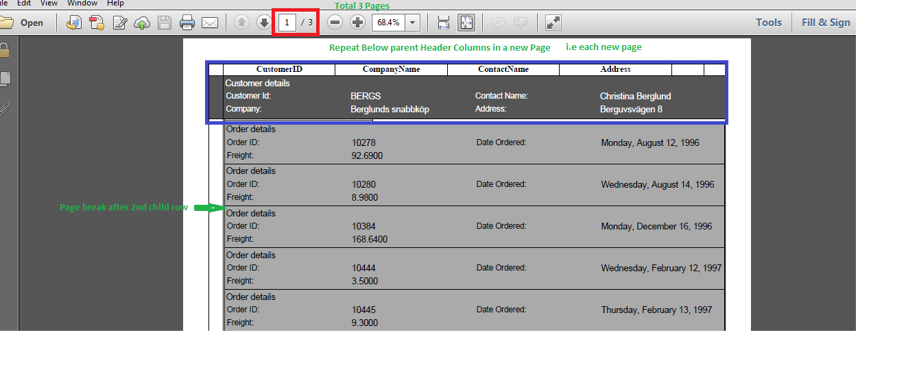 4) If Last Page has only 1 child row, export it with Parent Grid.Below are my codes and attached is desired PDF export.