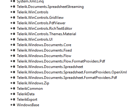 I was following documentation at Getting Started and RadFixedDocument Class and I have all the named assemblies referenced, but I still cannot see the Telerik.Windows.Pdf namespace at all. Much less the sought after RadFixedDocument object.