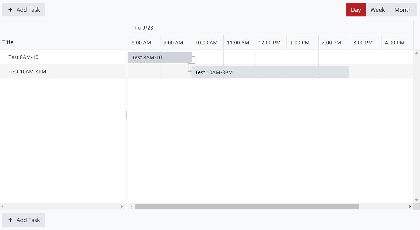 });I've attached a screenshot of the UI, which is great. The tasks are all working fine in the UI, the dependencies all work. You can see where the times are slotted in the UI.