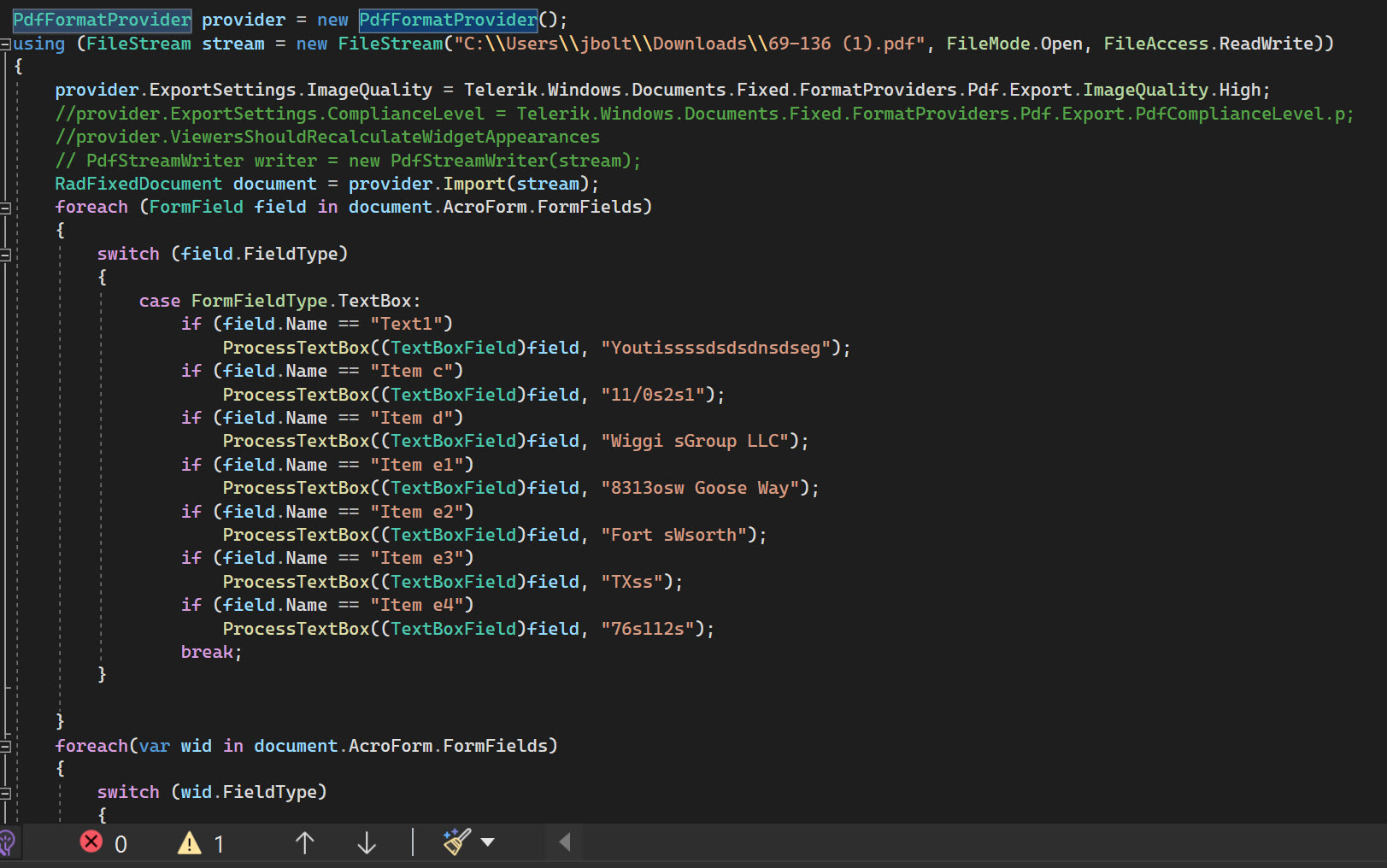 I am able to modify the field correctly and get them to have the correct value. When I export/save the file the form textboxes are all rotated vertically and the only fix I have been able to do is to modify the rotation of the field text in another editor. This kind of ruins the idea of code filling the pdf forms and automating the process. PDFFormatProvider / Telerik Document Processing library is 2022.1.106. I tried rotating the field after value edit to 0,90,etc...and they have all resulted in the similar issue.