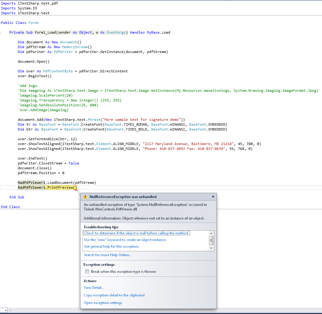 Imports iTextSharp.text.pdfImports System.IOImports iTextSharp.textPublic Class Form1 Private Sub Form1_Load(sender As Object, e As EventArgs) Handles MyBase.Load Dim document As New Document() Dim pdfStream As New MemoryStream() Dim pdfwriter As PdfWriter = pdfwriter.GetInstance(document, pdfStream) document.Open() Dim over As PdfContentByte = pdfwriter.DirectContent over.BeginText() 'Add logo. 'Dim imagelog As iTextSharp.text.Image = iTextSharp.text.Image.GetInstance(My.Resources.manalivelogo, System.Drawing.Imaging.ImageFormat.Jpeg) 'imagelog.ScalePercent(20) 'imagelog.Transparency = New Integer() {255, 255} 'imagelog.SetAbsolutePosition(25, 800) 'over.AddImage(imagelog) document.Add(New iTextSharp.text.Phrase("More sample text for signature demo")) Dim tr As BaseFont = BaseFont.CreateFont(BaseFont.TIMES_ROMAN, BaseFont.WINANSI, BaseFont.EMBEDDED) Dim btr As BaseFont = BaseFont.CreateFont(BaseFont.TIMES_BOLD, BaseFont.WINANSI, BaseFont.EMBEDDED) over.SetFontAndSize(btr, 12) over.ShowTextAligned(iTextSharp.text.Element.ALIGN_MIDDLE, "2117 Maryland Avenue, Baltimore, MD 21218", 45, 780, 0) over.ShowTextAligned(iTextSharp.text.Element.ALIGN_MIDDLE, "Phone: 410-837-4892 Fax: 410-837-0639", 55, 768, 0) over.EndText() pdfwriter.CloseStream = False document.Close() pdfStream.Position = 0 RadPdfViewer1.LoadDocument(pdfStream) RadPdfViewer1.PrintPreview() End Sub
