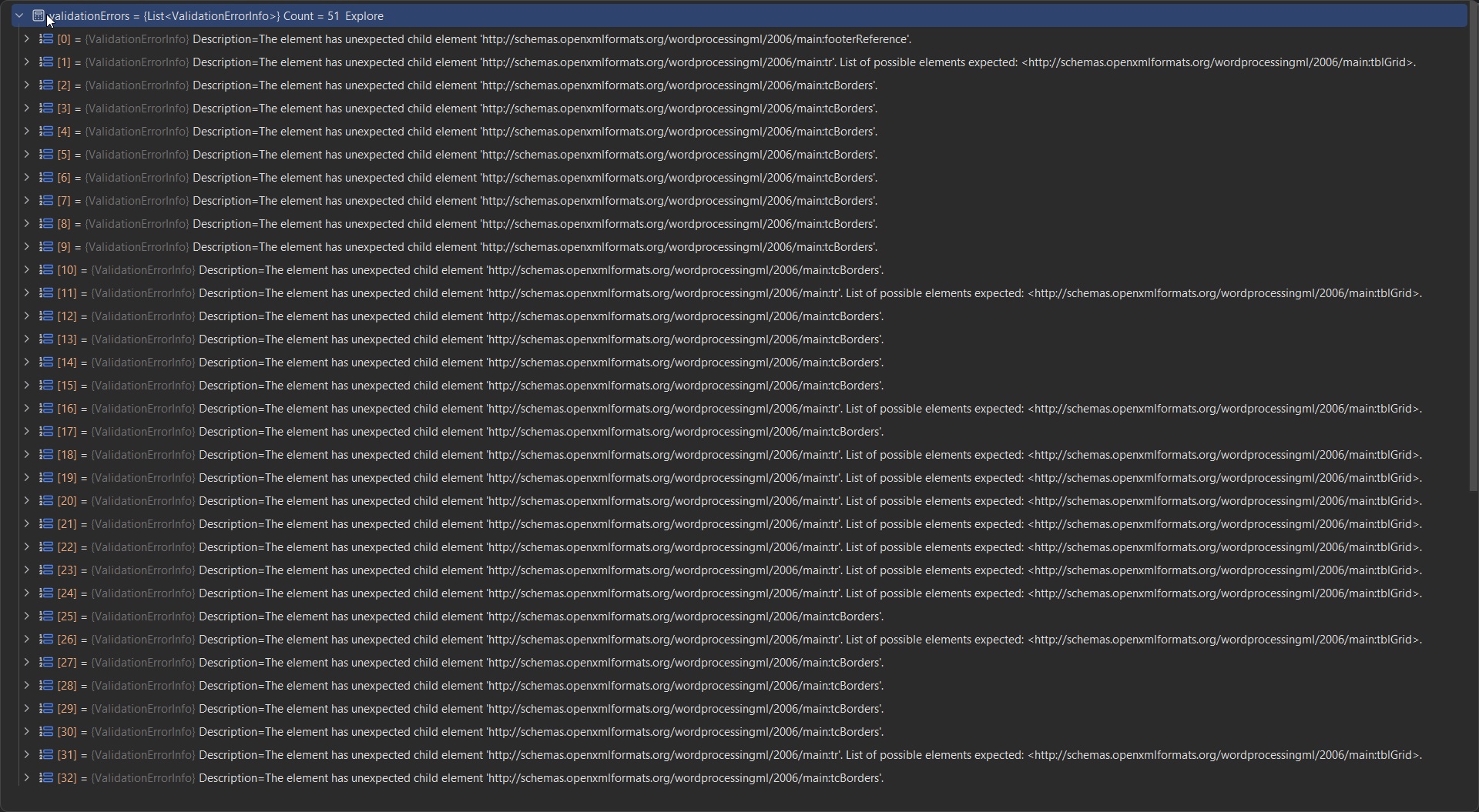 EDIT: When using this OpenXML validator: https://learn.microsoft.com/en-us/office/open-xml/word/how-to-validate-a-word-processing-document?tabs=cs-0%2Ccs against the Telerik created word docx file, I get a list of 51 errors. So Telerik Html to Docx perhaps is not creating a valid docx for various nodes.