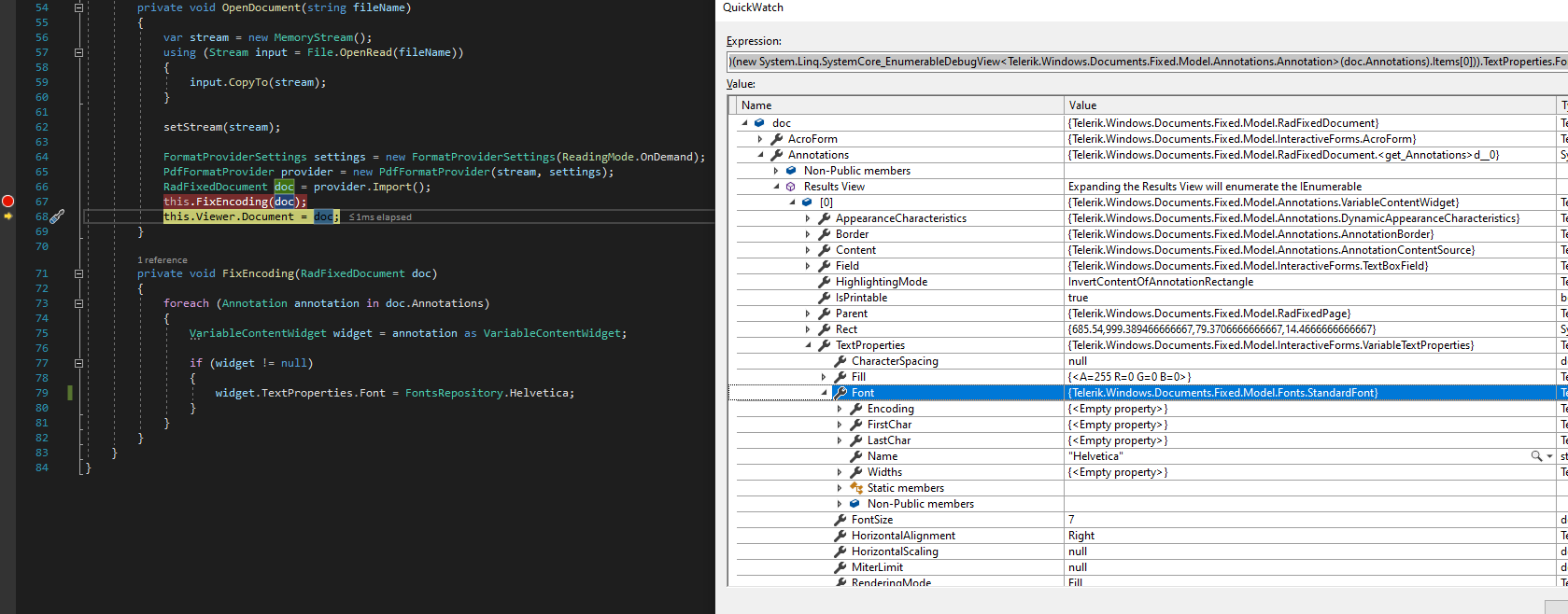 PdfFormatProvider pdfProcessingProvider = new PdfFormatProvider(); RadFixedDocument pdfProcessingDocument; using (Stream stream = File.OpenRead("SampleData/testFilePDF.pdf")) { pdfProcessingDocument = pdfProcessingProvider.Import(stream); } this.FixEncodingIssues(pdfProcessingDocument); byte[] data = pdfProcessingProvider.Export(pdfProcessingDocument); PdfFormatProvider pdfViewerProvider = new PdfFormatProvider(new MemoryStream(data), FormatProviderSettings.ReadOnDemand); this.pdfViewer.Document = pdfViewerProvider.Import();