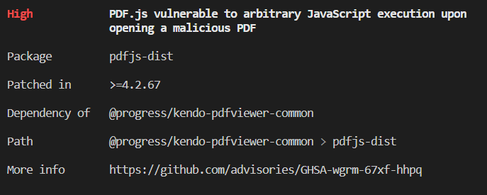 If I installed/Returned kendo-pdfviewer-common, in package-lock.json I see the requirementon pdfjs-dist in version 3.11.174 and the builder warns of a vulnerability problem with pdfjs.